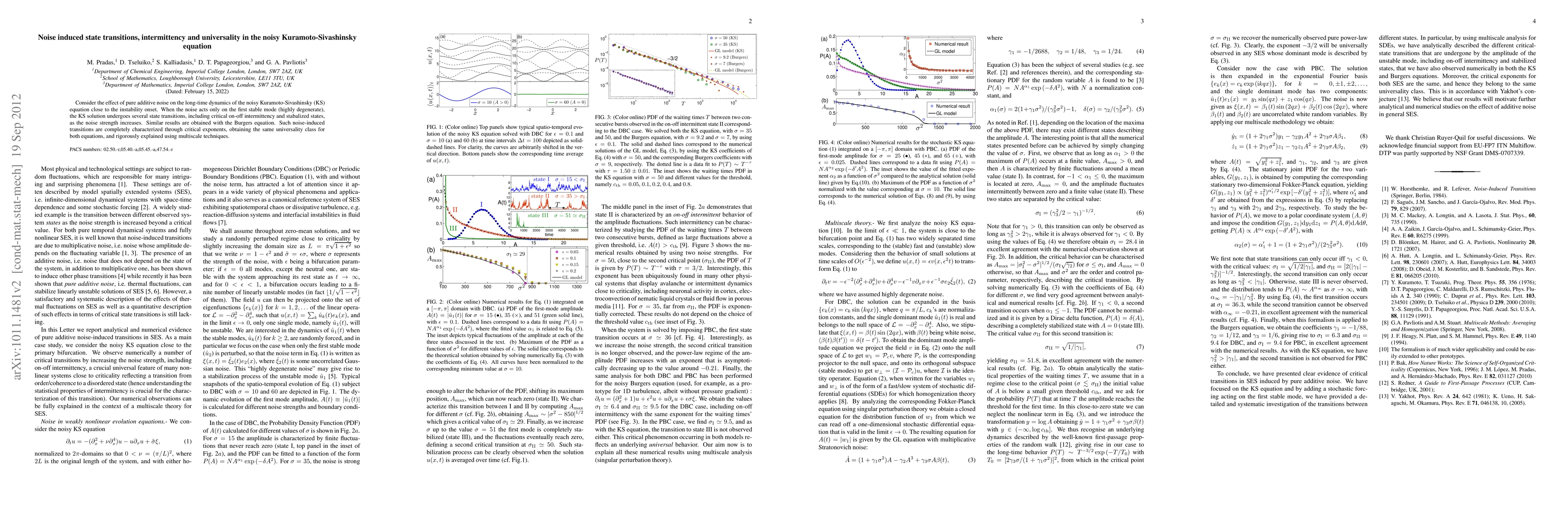 This paper investigates the impact of additive noise on the Kuramoto-Sivashinsky equation near instability onset, revealing state transitions and intermittency driven by highly degenerate noise acting on the first stable mode. The study finds that these transitions can be characterized by critical exponents, placing the KS and noisy Burgers equations within the same universality class.