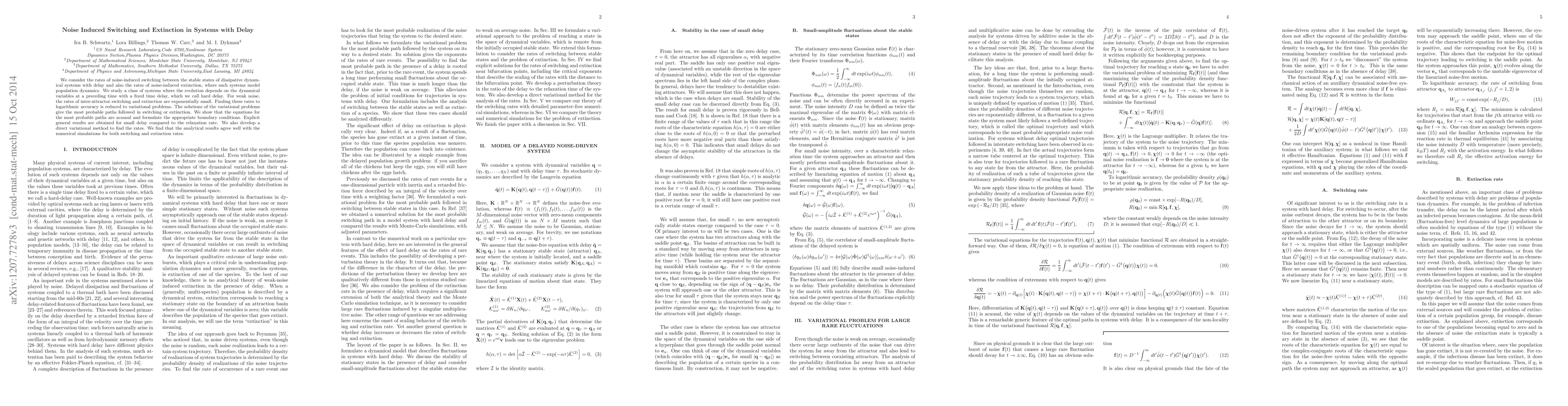 This paper investigates noise-induced switching and extinction in dynamical systems with delay, focusing on the rates of these phenomena in population dynamics models. It develops a variational method to determine the most probable paths for switching and extinction, showing that the equations governing these paths are acausal. Analytical results align well with numerical simulations.