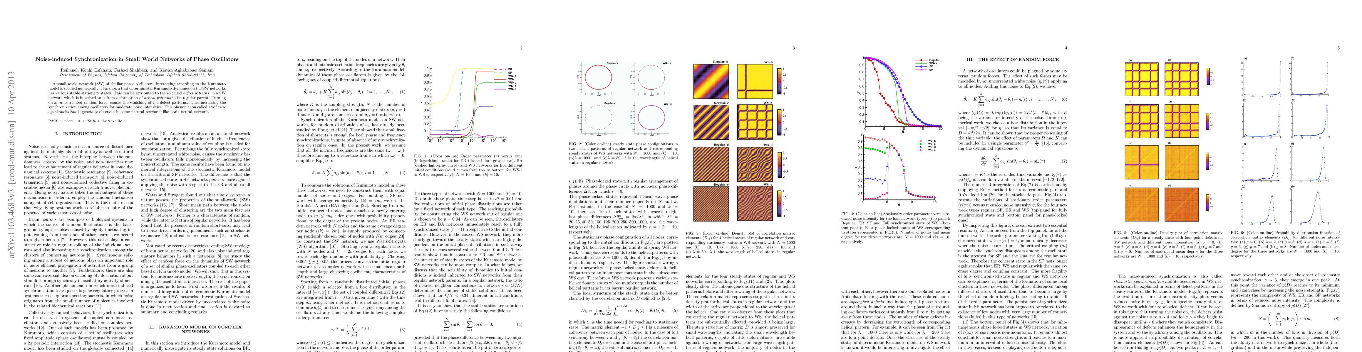 A small-world network (SW) of similar phase oscillators, interacting according to the Kuramoto model is studied numerically. It is shown that deterministic Kuramoto dynamics on the SW networks has various stable stationary states. This can be attributed to the "defect patterns" in a SW network which is inherited to it from deformation of "helical patterns" in its parent regular one. Turning on an uncorrelated random force, causes the vanishing of the defect patterns, hence increasing the synchronization among oscillators for intermediate noise intensities. This phenomenon which is called "stochastic synchronization" generally observed in some natural networks like brain neuronal network.