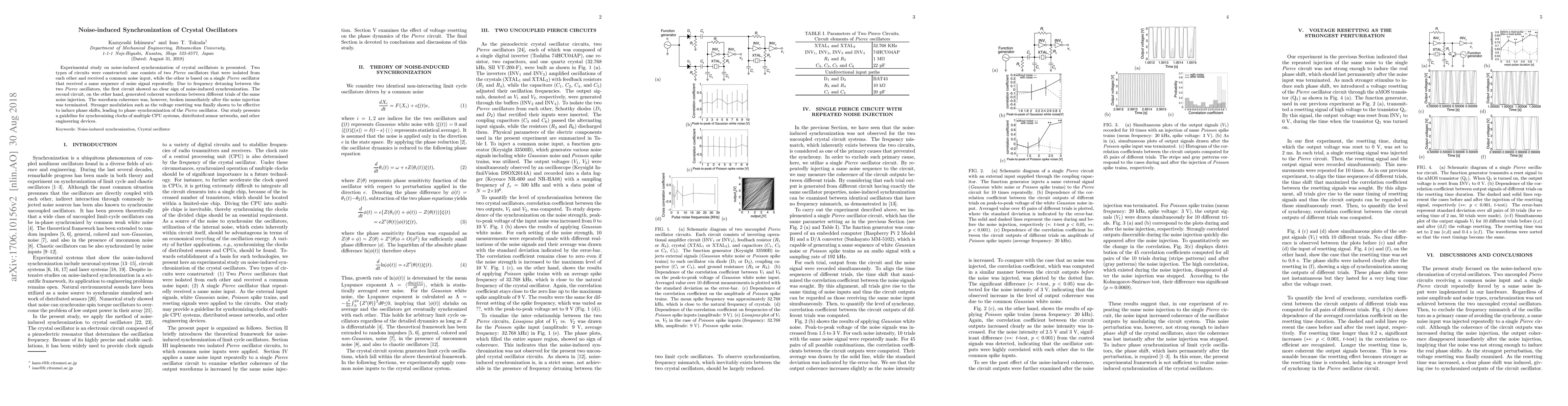 This research investigates noise-induced synchronization in crystal oscillators, finding that coherence occurs in a single oscillator subjected to repeated noise but not in two isolated oscillators with frequency detuning. Stronger modulation can induce phase-synchronization, offering insights for synchronizing clocks in distributed systems.