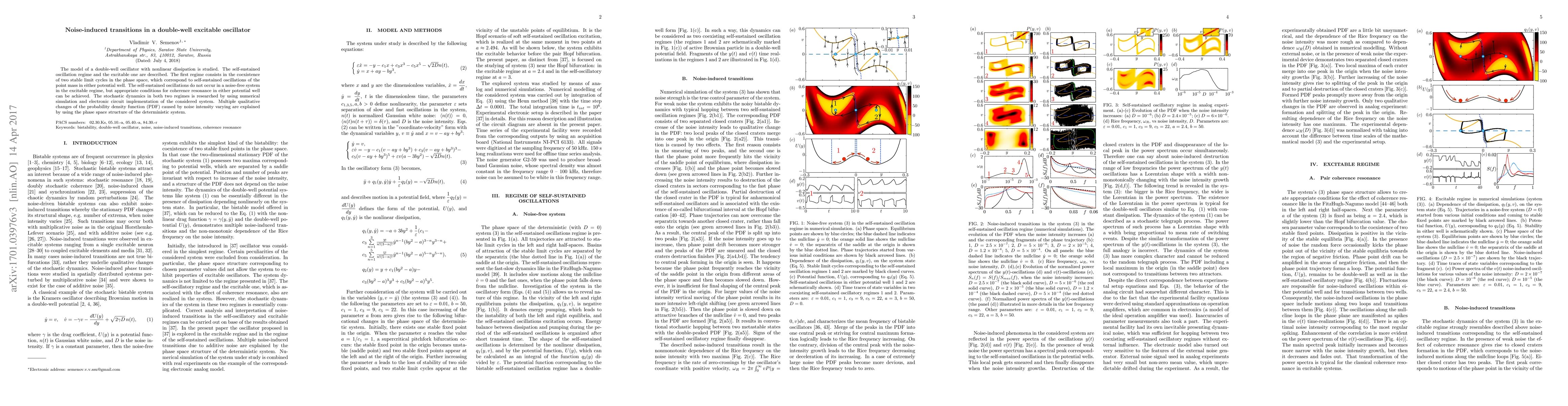 This paper investigates a double-well oscillator with nonlinear dissipation, exploring both self-sustained oscillations and excitable regimes. It uses numerical simulations and electronic circuits to study stochastic dynamics, revealing how varying noise intensity induces qualitative changes in the probability density function.