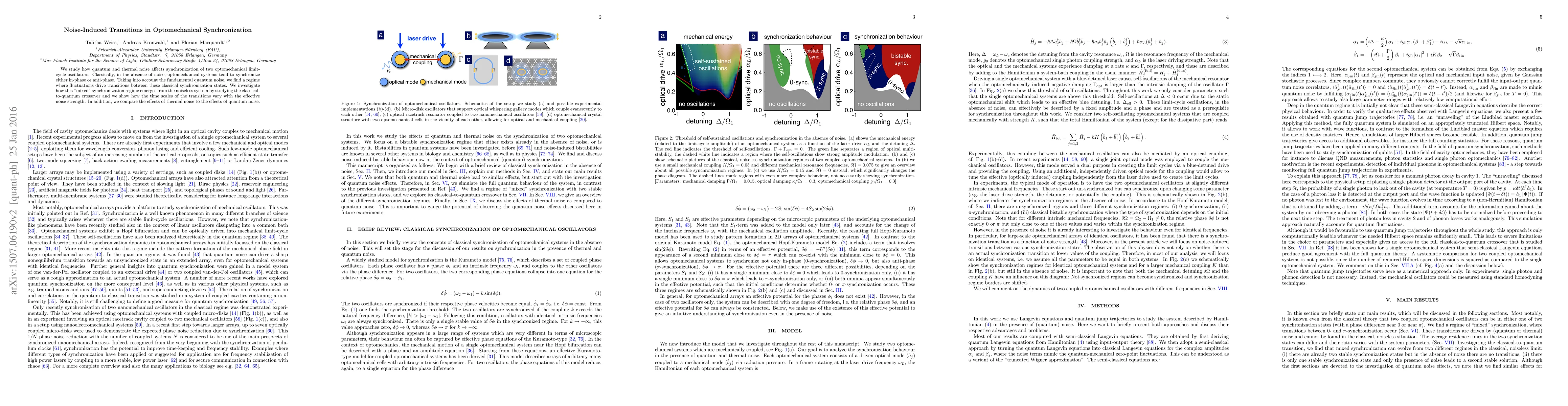 This research examines how quantum and thermal noise influence synchronization in optomechanical oscillators, revealing a "mixed" synchronization regime driven by fluctuations that transitions between classical in-phase and anti-phase states. The study explores the classical-to-quantum crossover and compares the impact of thermal noise versus quantum noise on these transitions.
