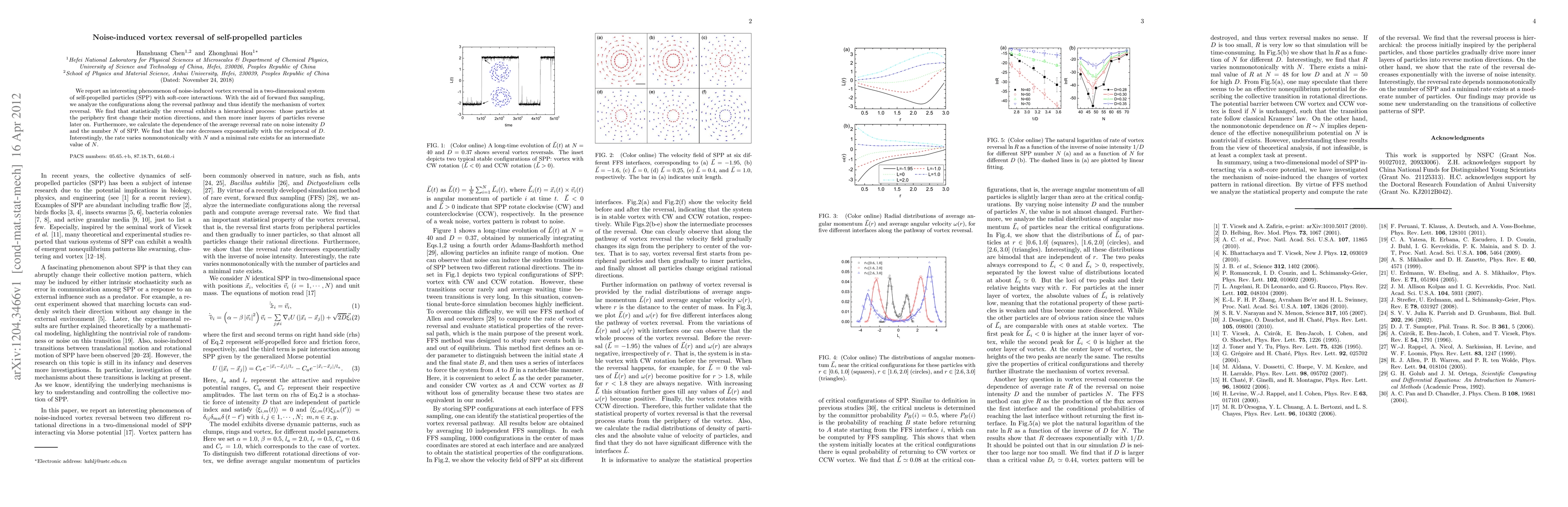 This paper investigates noise-induced vortex reversal in self-propelled particles with soft-core interactions, revealing a hierarchical reversal process starting from the periphery. The study finds that the reversal rate decreases exponentially with increasing noise intensity and exhibits a nonmonotonic dependence on the number of particles, with a minimal rate at an intermediate particle count.