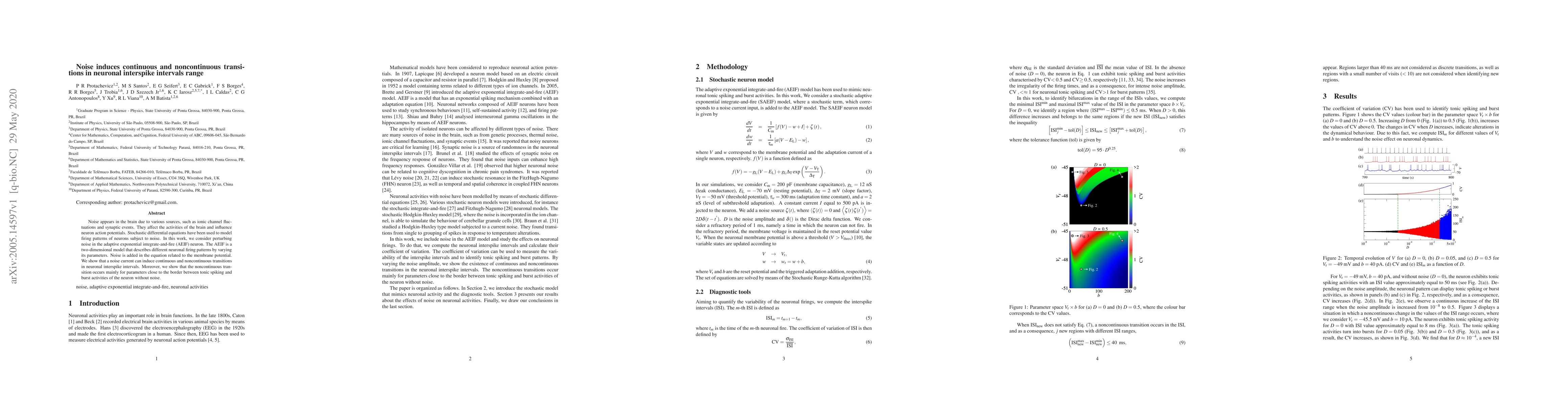 Noise appears in the brain due to various sources, such as ionic channel fluctuations and synaptic events. They affect the activities of the brain and influence neuron action potentials. Stochastic differential equations have been used to model firing patterns of neurons subject to noise. In this work, we consider perturbing noise in the adaptive exponential integrate-and-fire (AEIF) neuron. The AEIF is a two-dimensional model that describes different neuronal firing patterns by varying its parameters. Noise is added in the equation related to the membrane potential. We show that a noise current can induce continuous and noncontinuous transitions in neuronal interspike intervals. Moreover, we show that the noncontinuous transition occurs mainly for parameters close to the border between tonic spiking and burst activities of the neuron without noise.