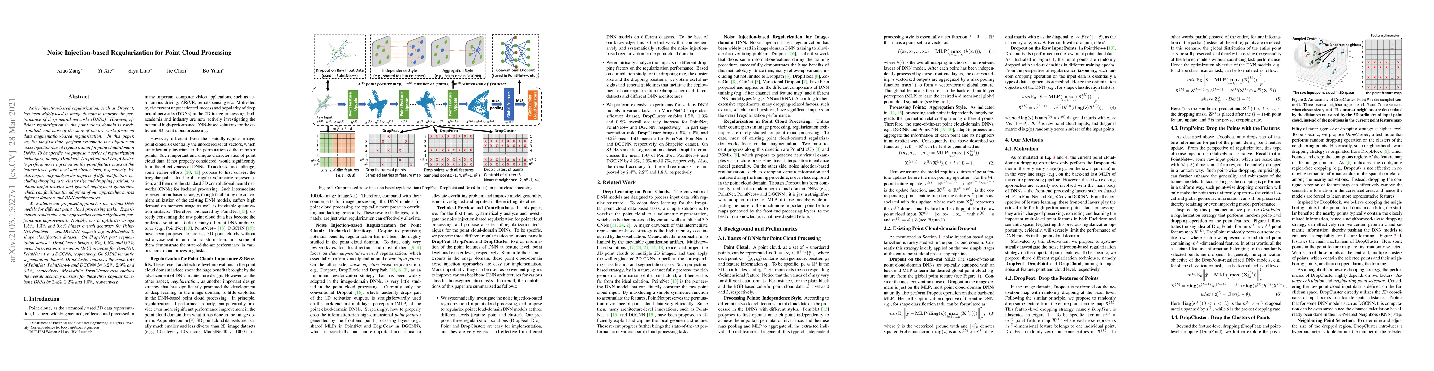 This paper investigates noise injection-based regularization for point cloud processing, proposing techniques like DropFeat, DropPoint, and DropCluster. Experimental results show significant performance improvements across various DNN models and tasks, with DropCluster achieving notable accuracy and IoU enhancements on several datasets.