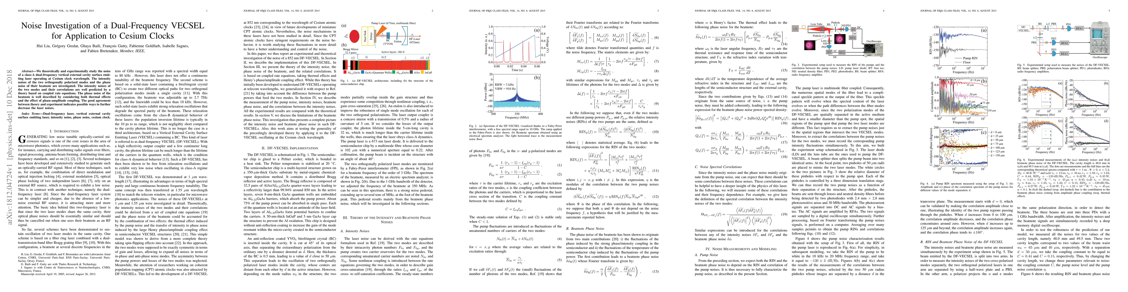 This paper investigates both theoretically and experimentally the noise characteristics of a dual-frequency vertical external cavity surface emitting laser (VECSEL) at Cesium clock wavelengths. The study reveals that intensity noises and phase noise of the laser modes can be accurately predicted by coupled rate equations and thermal effects, respectively, suggesting potential for reducing laser noise.