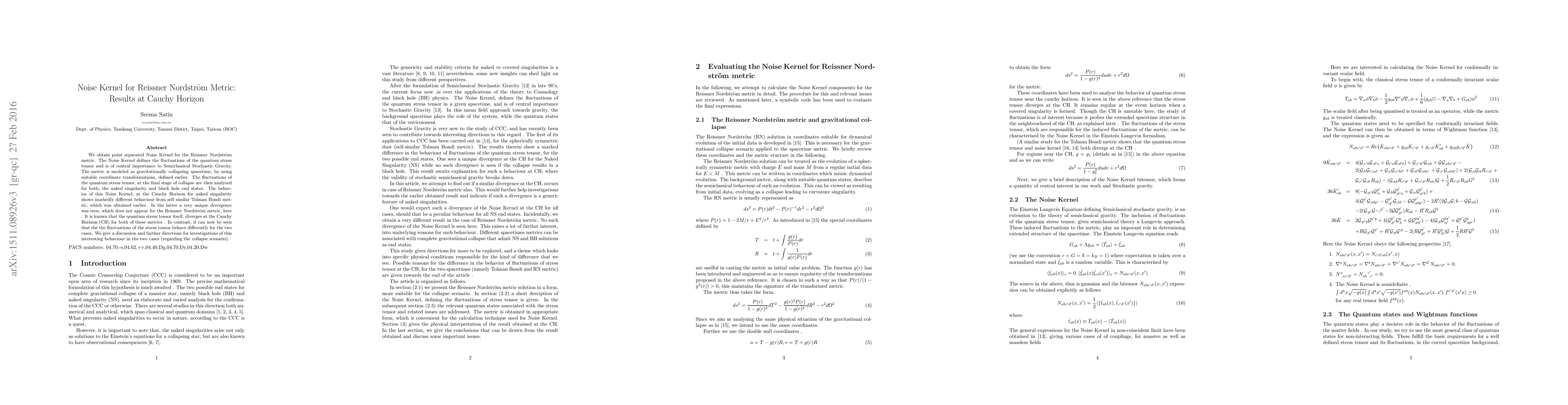 The paper presents explicit expressions for the Noise Kernel components in the Reissner-Nordström metric, demonstrating regularity at the Cauchy Horizon unlike the Tolman-Bondi metric.