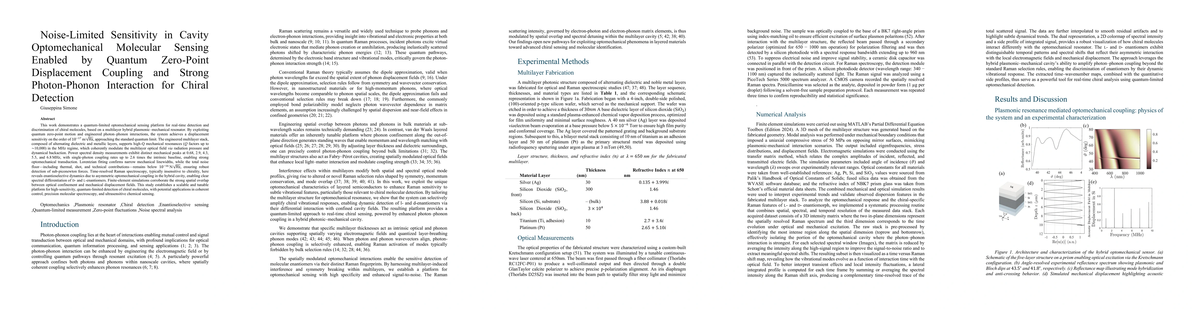 This work presents a quantum-limited optomechanical sensing platform for real-time detection and discrimination of chiral molecules, based on a multilayer hybrid plasmonic-mechanical resonator. Leveraging quantum zero-point motion and engineered photon-phonon interactions, the system achieves ultrahigh displacement sensitivity that approaches the fundamental quantum limit. The multilayer architecture, composed of alternating dielectric and metallic films, supports mechanical resonances with quality factors reaching approximately ten thousand in the megahertz frequency range. These resonances coherently modulate the optical field through radiation pressure and dynamical backaction. Power spectral density measurements reveal distinct mechanical peaks at 0.68, 2.9, 4.3, 5.5, and 6.8 MHz, with optomechanical coupling strengths exceeding twice the intrinsic baseline, enabling highly efficient signal transduction. Lorentzian fitting confirms the presence of sharp mechanical linewidths, while the total force noise, including thermal, shot, and technical contributions, remains below the threshold required for detecting sub-piconewton forces. Time-resolved Raman spectroscopy, which is typically insensitive to chirality, here reveals enantioselective dynamics arising from asymmetric optomechanical interactions, enabling clear spectral distinction between d- and l-enantiomers. Finite-element simulations validate the strong spatial overlap between optical confinement and mechanical displacement modes. This platform offers a scalable and tunable approach to quantum-limited, high-sensitivity chiral molecule detection, with applications in coherent control, precision spectroscopy, and chemical sensing.