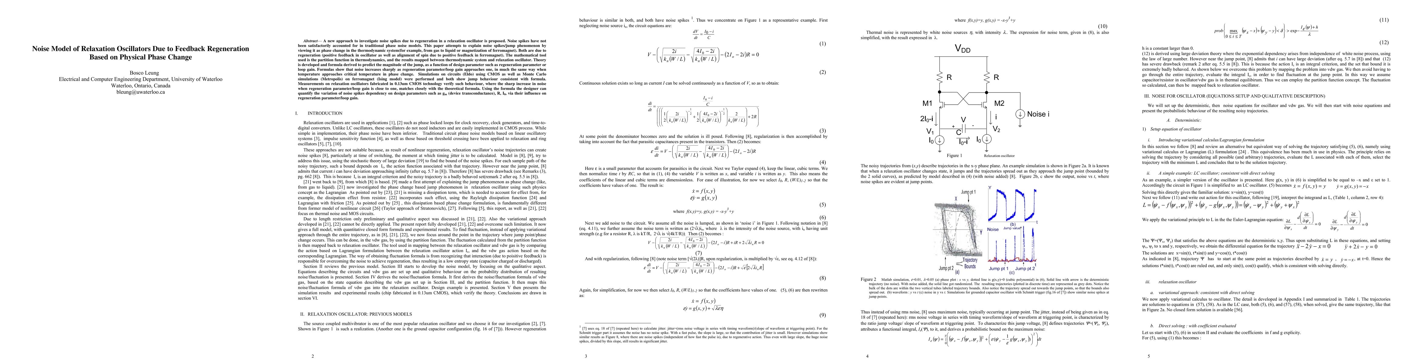 A new approach to investigate noise spikes due to regeneration in a relaxation oscillator is proposed. Noise spikes have not been satisfactorily accounted for in traditional phase noise models. This paper attempts to explain noise spikes/jump phenomenon by viewing it as phase change in the thermodynamic system(for example, from gas to liquid or magnetization of ferromagnet). Both are due to regeneration (positive feedback in oscillator as well as alignment of spin due to positive feedback in ferromagnet). The mathematical tool used is the partition function in thermodynamics, and the results mapped between thermodynamic system and relaxation oscillator. Theory is developed and formula derived to predict the magnitude of the jump, as a function of design parameter such as regeneration parameter or loop gain. Formulas show that noise increases sharply as regeneration parameter/loop gain approaches one, in much the same way when temperature approaches critical temperature in phase change. Simulations on circuits (Eldo) using CMOS as well as Monte Carlo simulations (Metropolis) on ferromagnet (Ising model) were performed and both show jump behaviour consistent with formula. Measurements on relaxation oscillators fabricated in 0.13um CMOS technology verify such behaviour, where the sharp increase in noise when regeneration parameter/loop gain is close to one, matches closely with the theoretical formula. Using the formula the designer can quantify the variation of noise spikes dependency on design parameters such as gm (device transconductance), R, I0, via their influence on regeneration parameter/loop gain.