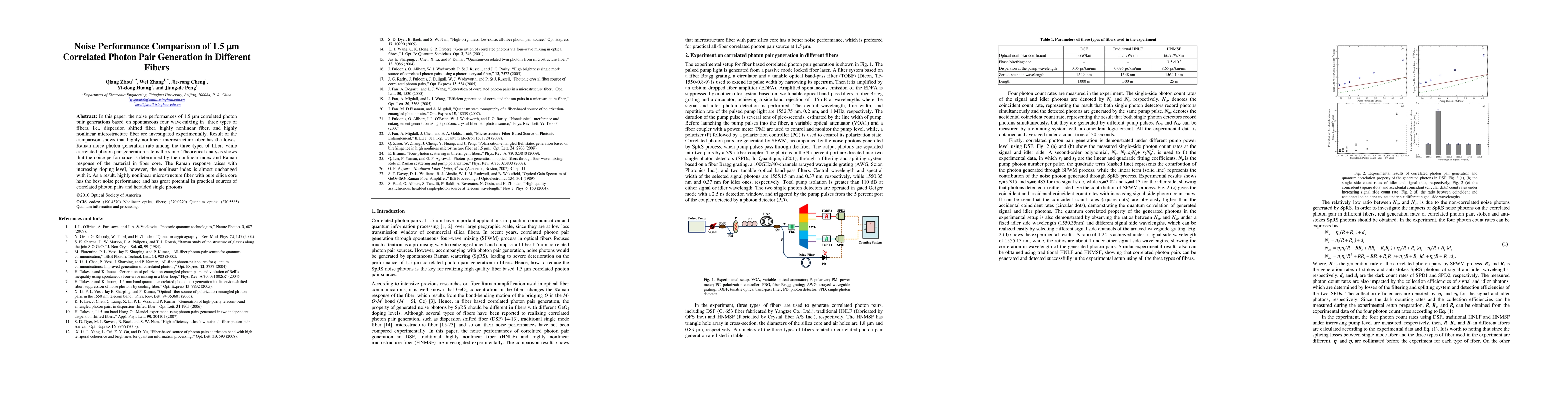 This paper experimentally compares the noise performance of 1.5 µm correlated photon pair generation in three fiber types, finding that highly nonlinear microstructure fiber exhibits the lowest Raman noise despite equal photon generation rates. Theoretical analysis attributes this to the fiber's nonlinear index and Raman response, highlighting the potential of pure silica core microstructure fibers for practical applications.