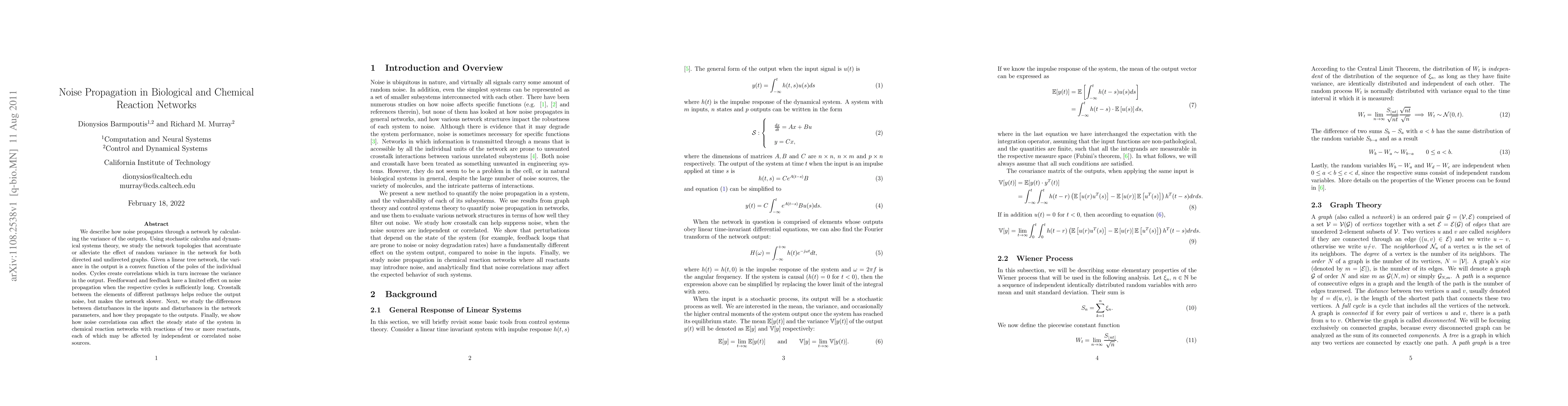 This study investigates how noise affects biological and chemical reaction networks, finding that network topologies like cycles increase variance in output and crosstalk reduces noise but slows the network.