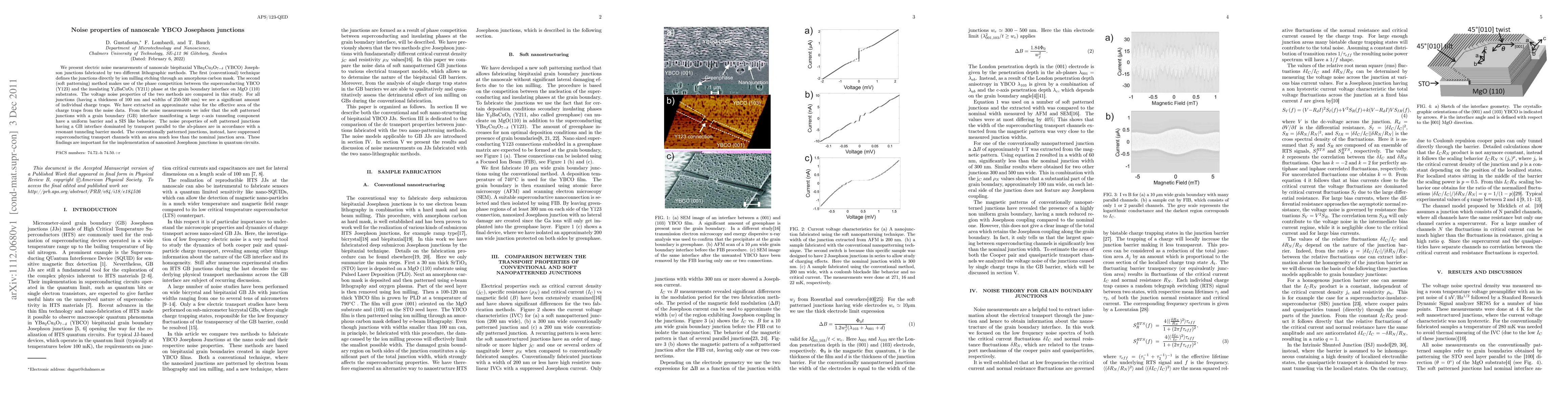 This study investigates the electric noise properties of nanoscale YBa2Cu3O(7-x) (YBCO) Josephson junctions fabricated via two different methods. Soft patterned junctions exhibit uniform barriers and SIS-like behavior, while conventionally patterned junctions show suppressed superconducting channels. The findings are crucial for the development of nanoscale quantum circuits.