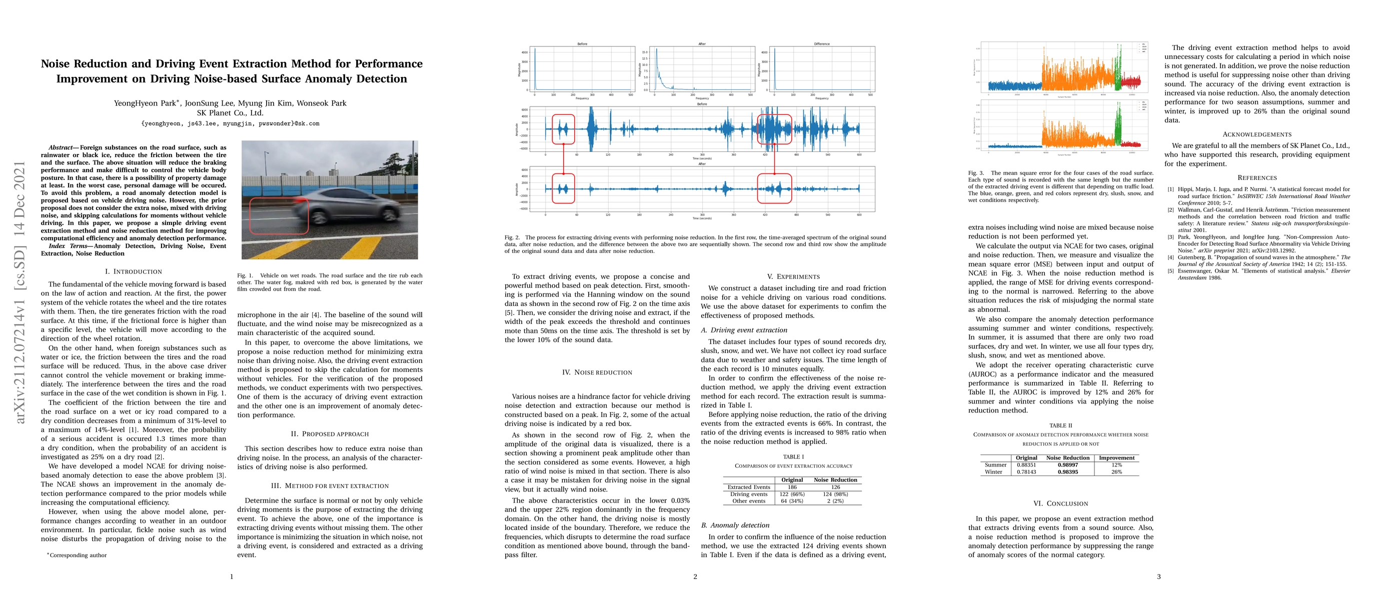 Foreign substances on the road surface, such as rainwater or black ice, reduce the friction between the tire and the surface. The above situation will reduce the braking performance and make difficult to control the vehicle body posture. In that case, there is a possibility of property damage at least. In the worst case, personal damage will be occured. To avoid this problem, a road anomaly detection model is proposed based on vehicle driving noise. However, the prior proposal does not consider the extra noise, mixed with driving noise, and skipping calculations for moments without vehicle driving. In this paper, we propose a simple driving event extraction method and noise reduction method for improving computational efficiency and anomaly detection performance.