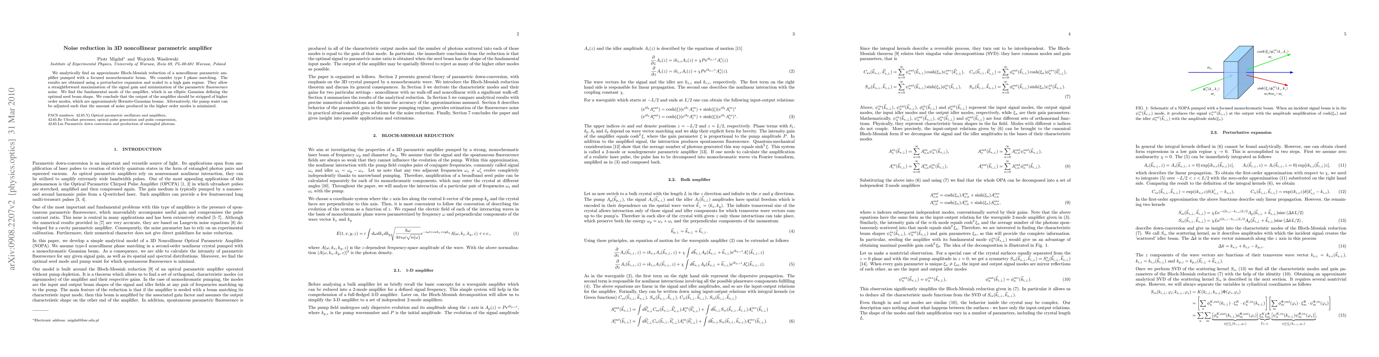 This paper analytically determines the optimal conditions for noise reduction in a 3D noncollinear parametric amplifier using a focused monochromatic beam, achieving high gain while minimizing parametric fluorescence noise. The study finds that the fundamental mode is an elliptic Gaussian, and higher order modes, which are Hermite-Gaussian, should be minimized to further reduce noise.