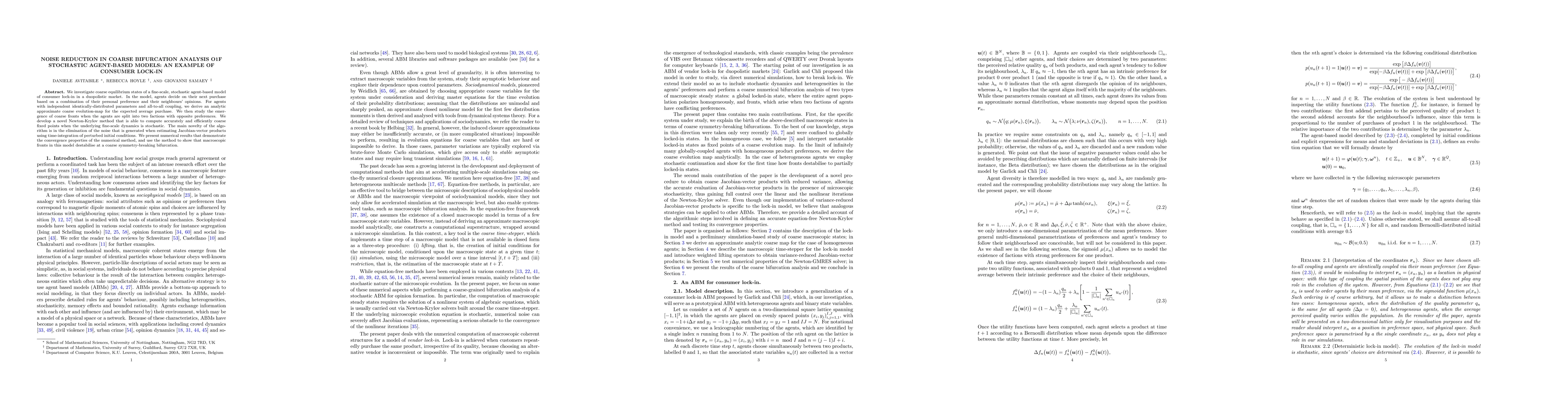 We investigate coarse equilibrium states of a fine-scale, stochastic agent-based model of consumer lock-in in a duopolistic market. In the model, agents decide on their next purchase based on a combination of their personal preference and their neighbours' opinions. For agents with independent identically-distributed parameters and all-to-all coupling, we derive an analytic approximate coarse evolution-map for the expected average purchase. We then study the emergence of coarse fronts when spatial segregation is present in the relative perceived quality of products. We develop a novel Newton-Krylov method that is able to compute accurately and efficiently coarse fixed points when the underlying fine-scale dynamics is stochastic. The main novelty of the algorithm is in the elimination of the noise that is generated when estimating Jacobian-vector products using time-integration of perturbed initial conditions. We present numerical results that demonstrate the convergence properties of the numerical method, and use the method to show that macroscopic fronts in this model destabilise at a coarse symmetry-breaking bifurcation.