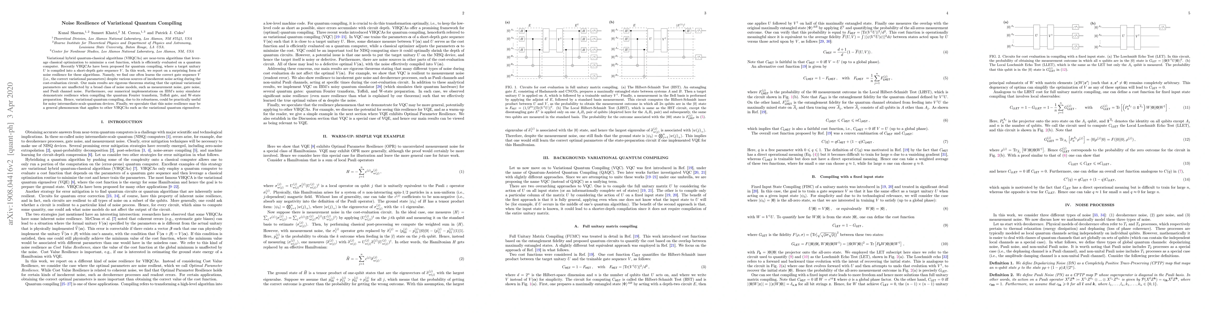 Variational hybrid quantum-classical algorithms (VHQCAs) are near-term algorithms that leverage classical optimization to minimize a cost function, which is efficiently evaluated on a quantum computer. Recently VHQCAs have been proposed for quantum compiling, where a target unitary $U$ is compiled into a short-depth gate sequence $V$. In this work, we report on a surprising form of noise resilience for these algorithms. Namely, we find one often learns the correct gate sequence $V$ (i.e., the correct variational parameters) despite various sources of incoherent noise acting during the cost-evaluation circuit. Our main results are rigorous theorems stating that the optimal variational parameters are unaffected by a broad class of noise models, such as measurement noise, gate noise, and Pauli channel noise. Furthermore, our numerical implementations on IBM's noisy simulator demonstrate resilience when compiling the quantum Fourier transform, Toffoli gate, and W-state preparation. Hence, variational quantum compiling, due to its robustness, could be practically useful for noisy intermediate-scale quantum devices. Finally, we speculate that this noise resilience may be a general phenomenon that applies to other VHQCAs such as the variational quantum eigensolver.