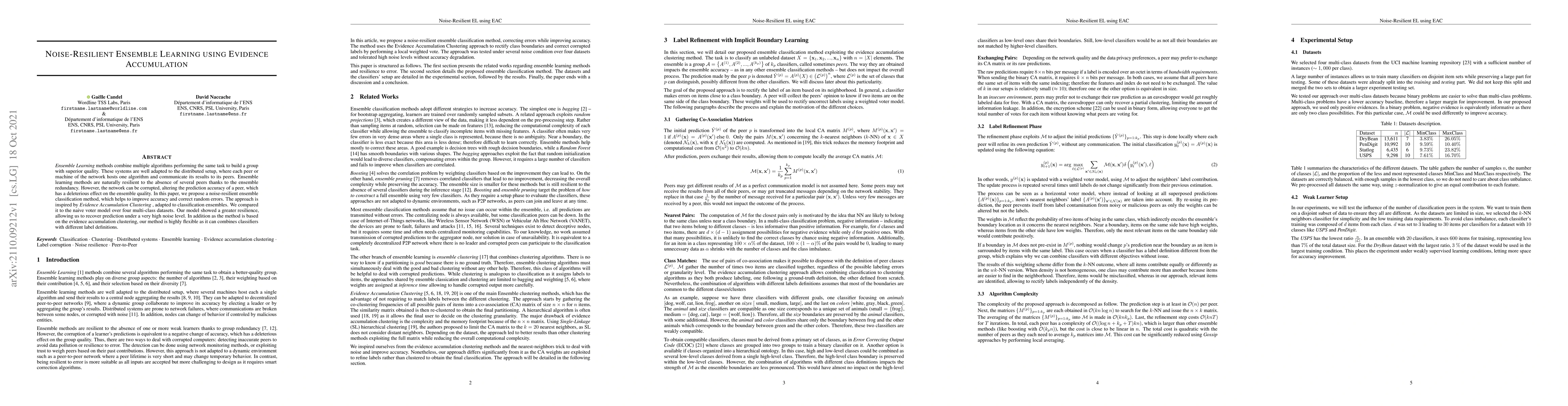 This paper proposes a noise-resilient ensemble learning method inspired by Evidence Accumulation Clustering, which improves classification accuracy by correcting random errors. The method demonstrated greater resilience and flexibility compared to the naive voter model across four multi-class datasets.