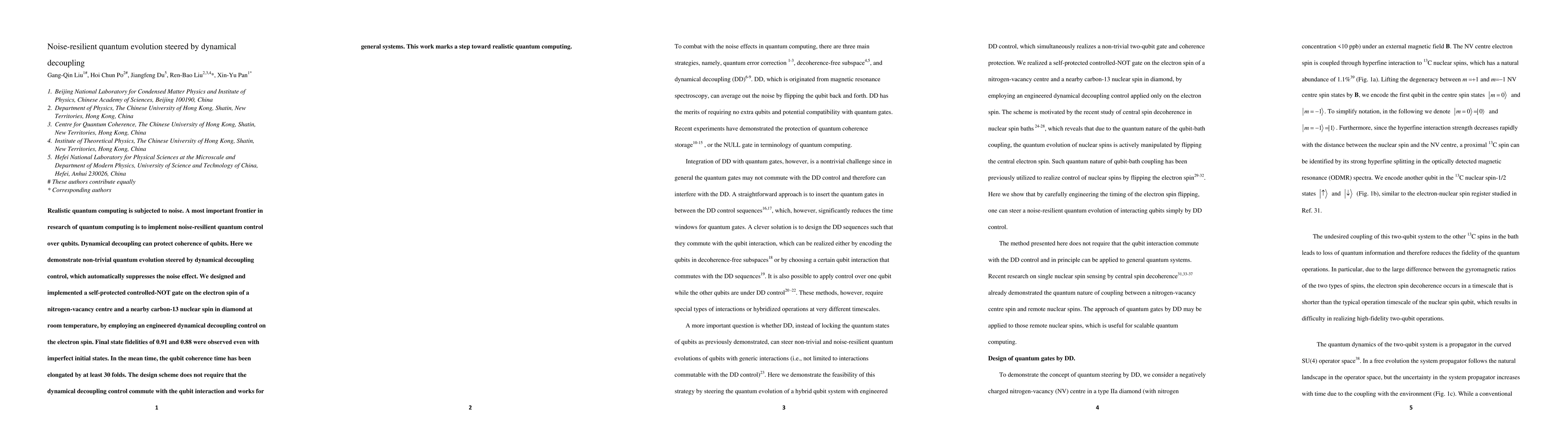 This paper demonstrates a noise-resilient quantum evolution using dynamical decoupling to protect qubit coherence, achieving high fidelity controlled-NOT gates on electron and nuclear spins in diamond at room temperature. The method significantly extends qubit coherence time and is applicable to general quantum systems.
