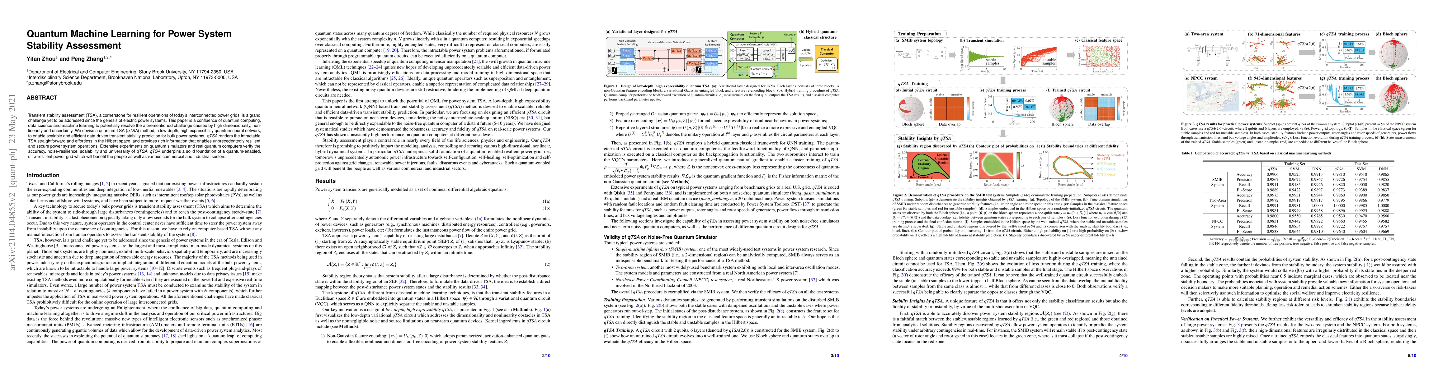 This paper introduces a quantum machine learning method, qTSA, for transient stability assessment in power systems, leveraging quantum neural networks and natural gradient descent for efficient training. Experiments demonstrate its accuracy, noise-resilience, scalability, and effectiveness in quantum computing environments.
