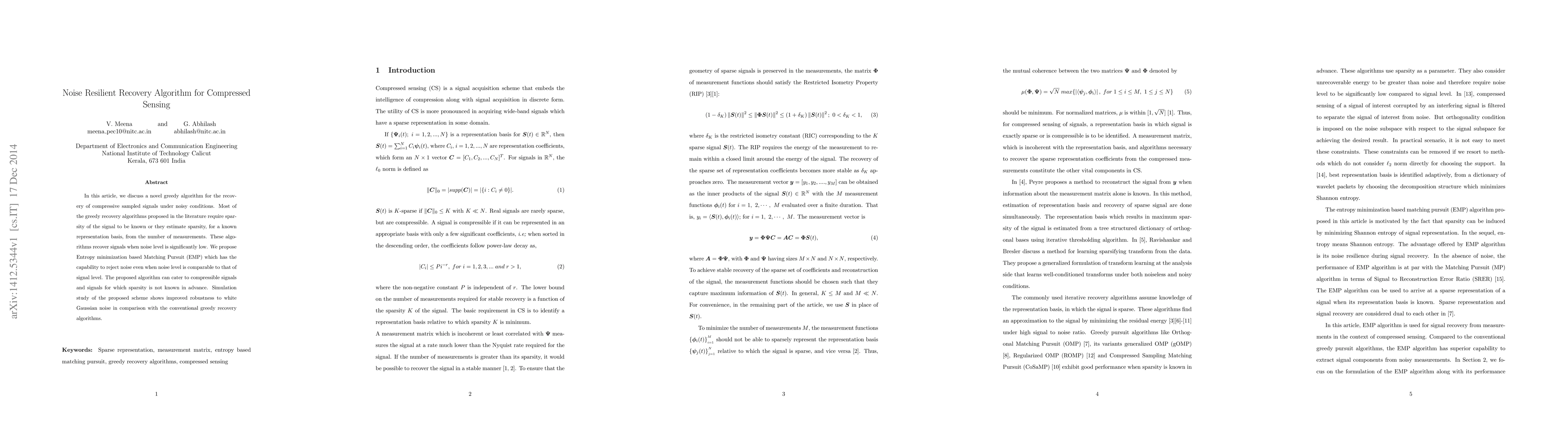 This paper introduces an Entropy minimization based Matching Pursuit (EMP) algorithm for recovering compressed sensing signals under noisy conditions, demonstrating improved robustness compared to conventional greedy algorithms, especially when noise levels are comparable to signal levels. The EMP algorithm effectively handles signals with unknown sparsity.
