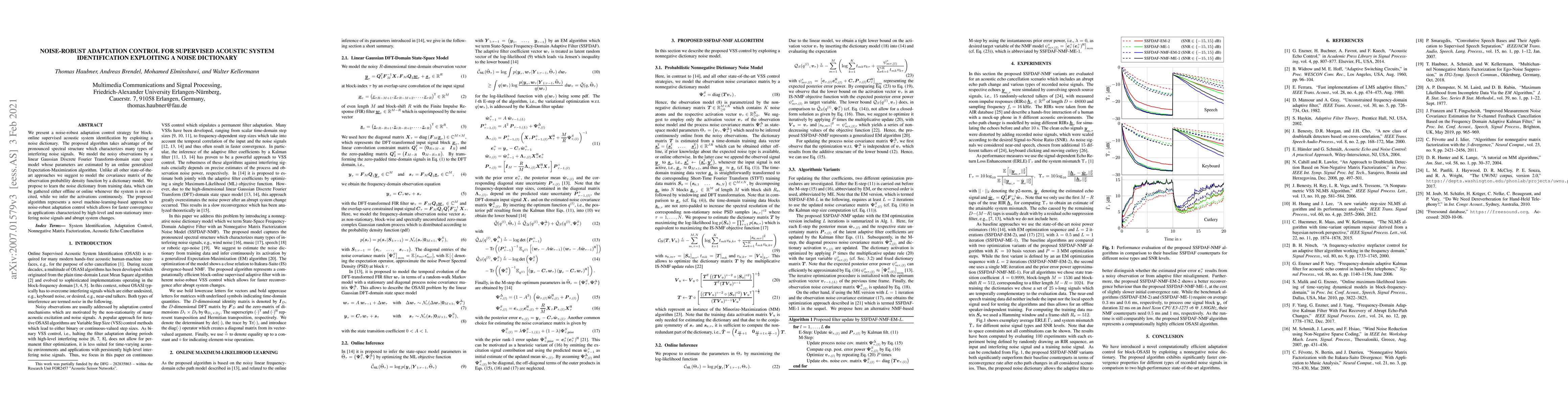 This paper proposes a noise-robust adaptation control strategy for supervised acoustic systems using a noise dictionary to model interfering noise signals. The algorithm leverages a linear Gaussian state-space model and an online generalized Expectation-Maximization algorithm, with a novel dictionary model for the covariance matrix to achieve faster convergence in noisy environments.