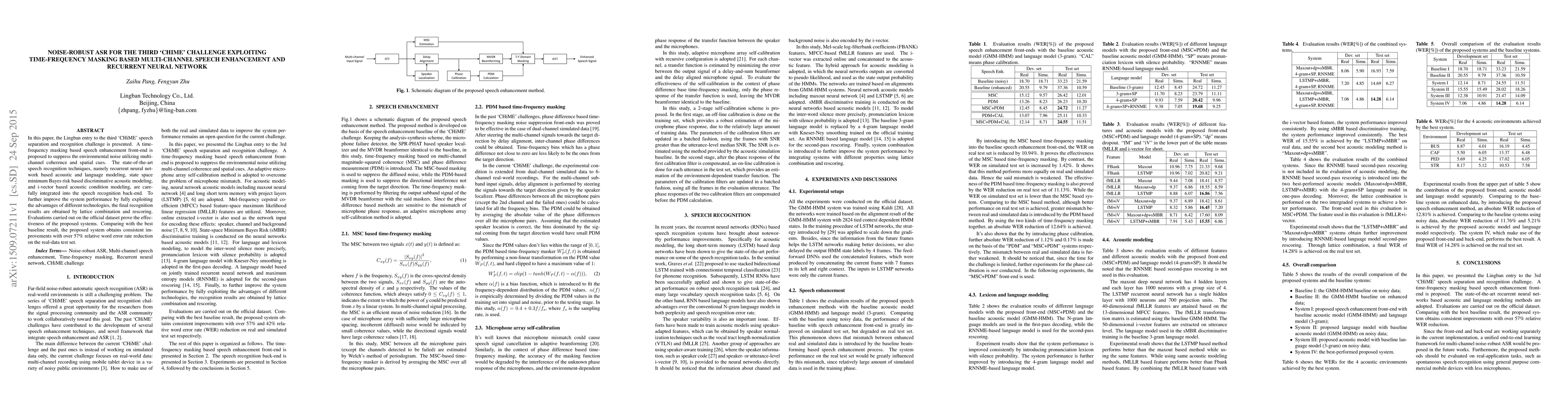 In this paper, the Lingban entry to the third 'CHiME' speech separation and recognition challenge is presented. A time-frequency masking based speech enhancement front-end is proposed to suppress the environmental noise utilizing multi-channel coherence and spatial cues. The state-of-the-art speech recognition techniques, namely recurrent neural network based acoustic and language modeling, state space minimum Bayes risk based discriminative acoustic modeling, and i-vector based acoustic condition modeling, are carefully integrated into the speech recognition back-end. To further improve the system performance by fully exploiting the advantages of different technologies, the final recognition results are obtained by lattice combination and rescoring. Evaluations carried out on the official dataset prove the effectiveness of the proposed systems. Comparing with the best baseline result, the proposed system obtains consistent improvements with over 57% relative word error rate reduction on the real-data test set.