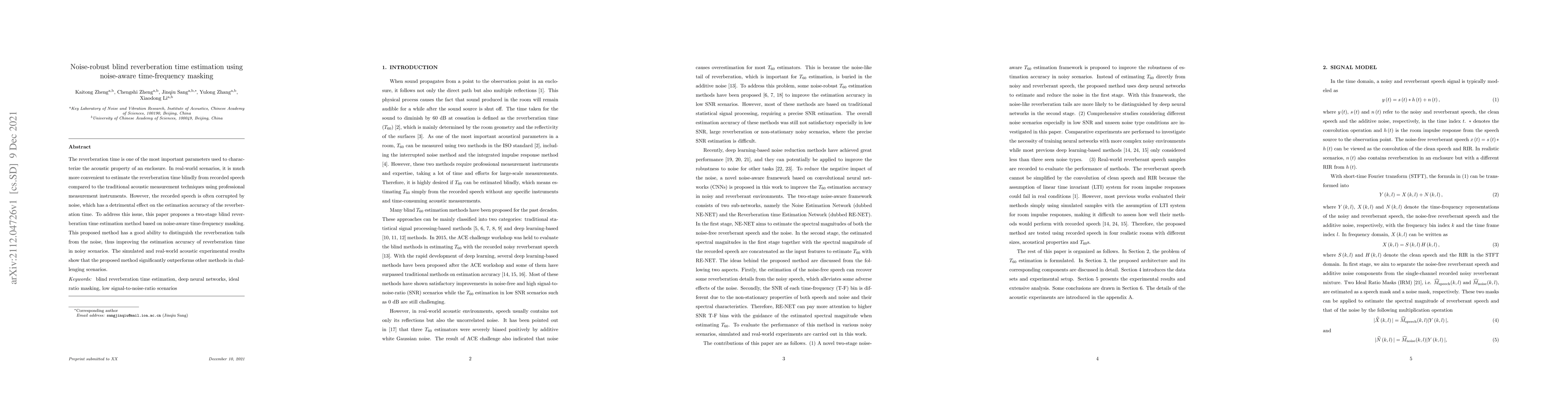 This paper proposes a two-stage blind reverberation time estimation method using noise-aware time-frequency masking to improve accuracy in noisy environments. The method effectively distinguishes reverberation tails from noise, significantly outperforming other techniques in both simulated and real-world acoustic tests.