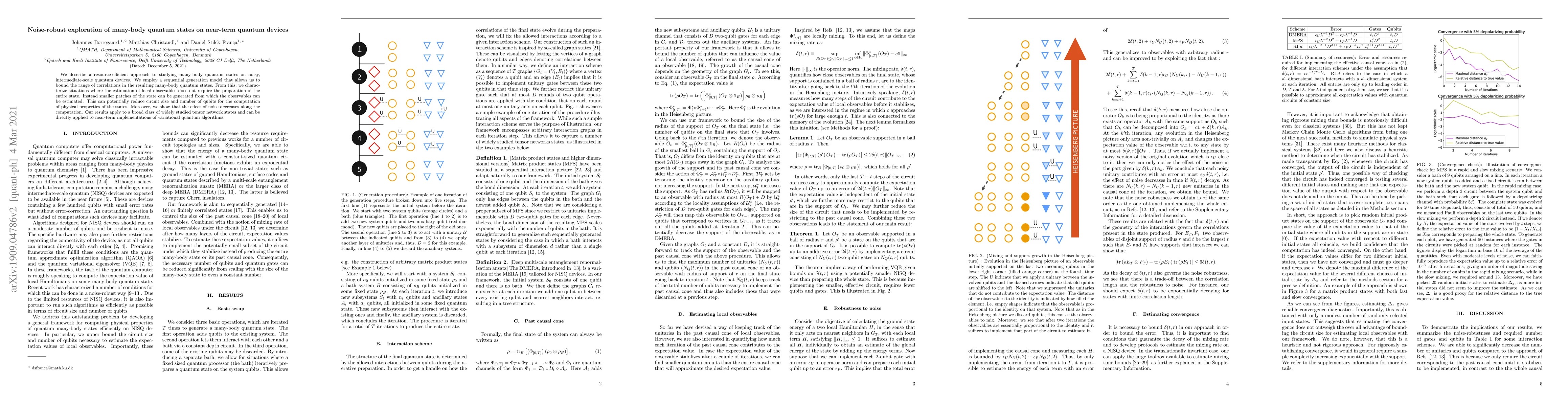 We describe a resource-efficient approach to studying many-body quantum states on noisy, intermediate-scale quantum devices. We employ a sequential generation model that allows us to bound the range of correlations in the resulting many-body quantum states. From this, we characterize situations where the estimation of local observables does not require the preparation of the entire state. Instead smaller patches of the state can be generated from which the observables can be estimated. This can potentially reduce circuit size and number of qubits for the computation of physical properties of the states. Moreover, we show that the effect of noise decreases along the computation. Our results apply to a broad class of widely studied tensor network states and can be directly applied to near-term implementations of variational quantum algorithms.