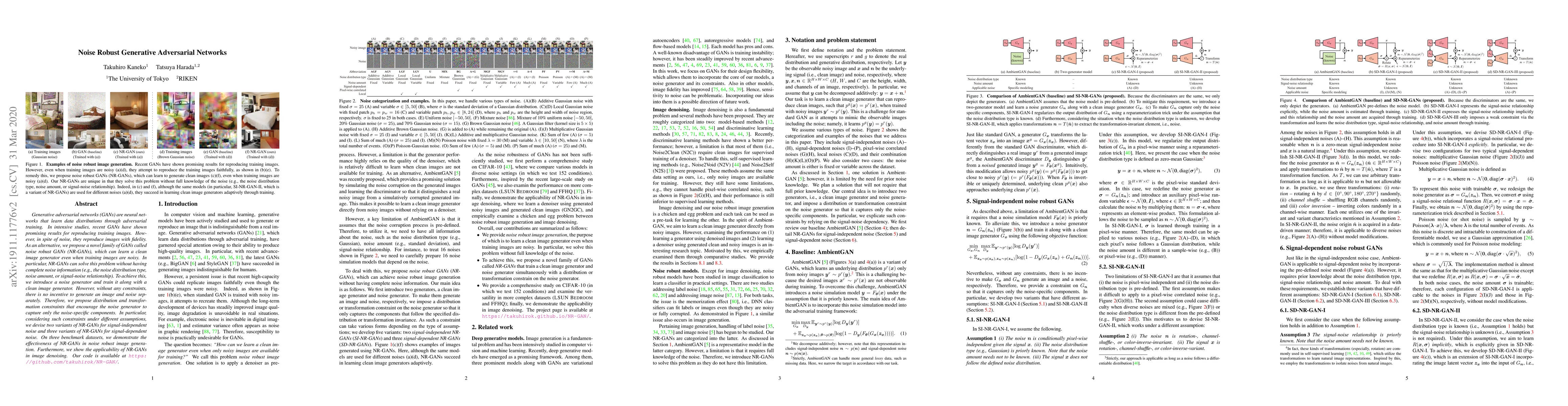 This paper proposes noise robust GANs (NR-GANs) to generate clean images from noisy training data without requiring complete noise information. NR-GANs introduce a noise generator and use distribution and transformation constraints to separate noise components, developing variants for both signal-independent and signal-dependent noise, and demonstrating their effectiveness in noise-robust image generation and denoising.