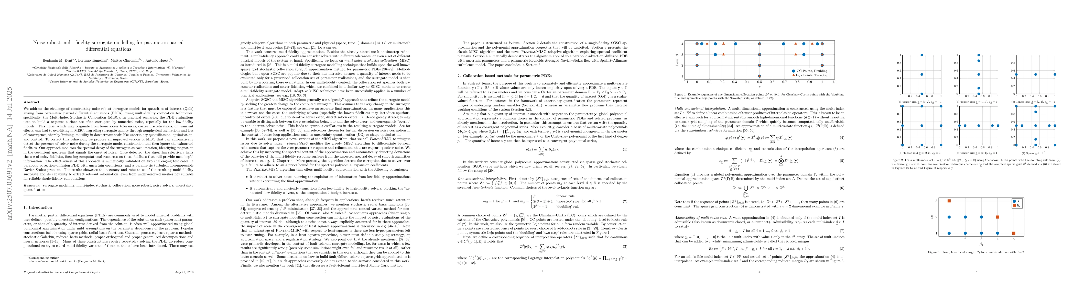 We address the challenge of constructing noise-robust surrogate models for quantities of interest (QoIs) arising from parametric partial differential equations (PDEs), using multi-fidelity collocation techniques; specifically, the Multi-Index Stochastic Collocation (MISC). In practical scenarios, the PDE evaluations used to build a response surface are often corrupted by numerical noise, especially for the low-fidelity models. This noise, which may originate from loose solver tolerances, coarse discretisations, or transient effects, can lead to overfitting in MISC, degrading surrogate quality through nonphysical oscillations and loss of convergence, thereby limiting its utility in downstream tasks like uncertainty quantification, optimisation, and control. To correct this behaviour, we propose an improved version of MISC that can automatically detect the presence of solver noise during the surrogate model construction and then ignore the exhausted fidelities. Our approach monitors the spectral decay of the surrogate at each iteration, identifying stagnation in the coefficient spectrum that signals the onset of noise. Once detected, the algorithm selectively halts the use of noisy fidelities, focusing computational resources on those fidelities that still provide meaningful information. The effectiveness of this approach is numerically validated on two challenging test cases: a parabolic advection--diffusion PDE with uncertain coefficients, and a parametric turbulent incompressible Navier--Stokes problem. The results showcase the accuracy and robustness of the resulting multi-fidelity surrogate and its capability to extract relevant information, even from under-resolved meshes not suitable for reliable single-fidelity computations.