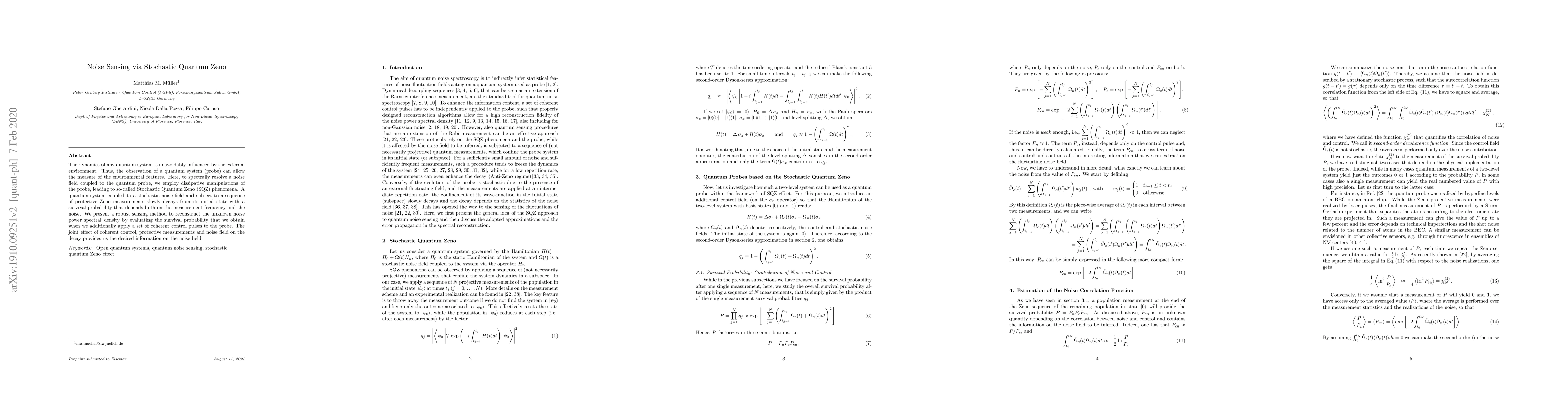 This paper proposes a method for sensing environmental noise fields using Stochastic Quantum Zeno (SQZ) phenomena. By employing a sequence of protective measurements and coherent control pulses on a quantum probe, the authors reconstruct the noise power spectral density based on the probe's decay dynamics.