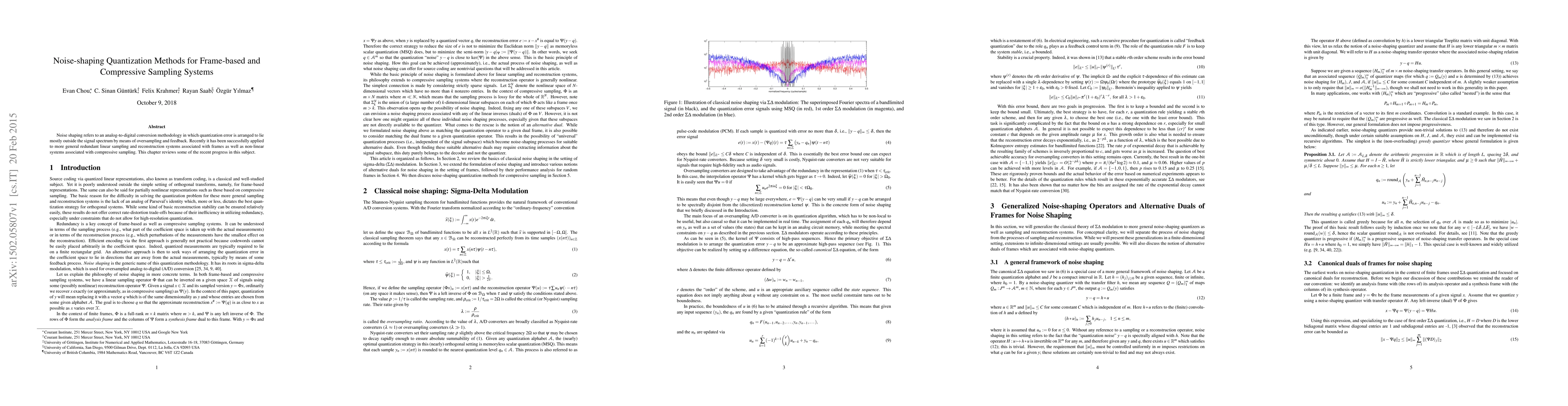 Noise shaping refers to an analog-to-digital conversion methodology in which quantization error is arranged to lie mostly outside the signal spectrum by means of oversampling and feedback. Recently it has been successfully applied to more general redundant linear sampling and reconstruction systems associated with frames as well as non-linear systems associated with compressive sampling. This chapter reviews some of the recent progress in this subject.