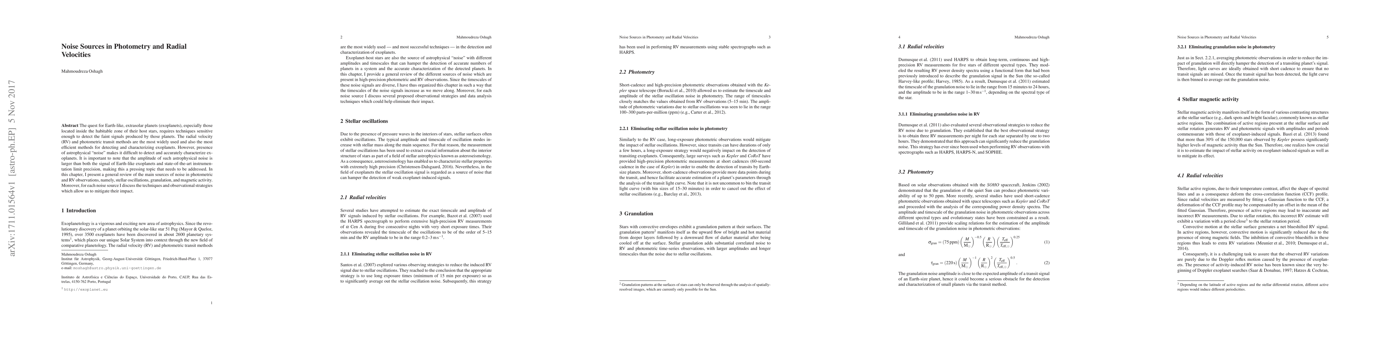 A study reviews key noise sources in photometry and radial velocities, highlighting stellar oscillations, granulation, and magnetic activity as major challenges for detecting Earth-like exoplanets. Techniques to mitigate these impacts are discussed to improve the sensitivity of RV and photometric transit methods.