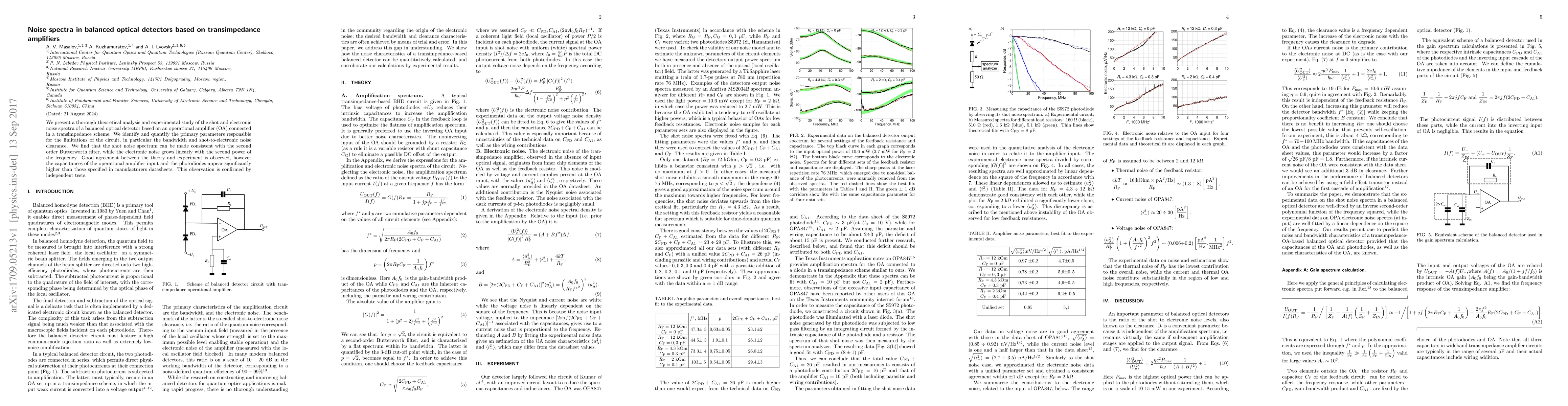 We present a thorough theoretical analysis and experimental study of the shot and electronic noise spectra of a balanced optical detector based on an operational amplifier (OA) connected in a transimpedance scheme. We identify and quantify the primary parameters responsible for the limitations of the circuit, in particular the bandwidth and shot-to-electronic noise clearance. We find that the shot noise spectrum can be made consistent with the second order Butterworth filter, while the electronic noise grows linearly with the second power of the frequency. Good agreement between the theory and experiment is observed, however the capacitances of the operational amplifier input and the photodiodes appear significantly higher than those specified in manufacturers' datasheets. This observation is confirmed by independent tests.