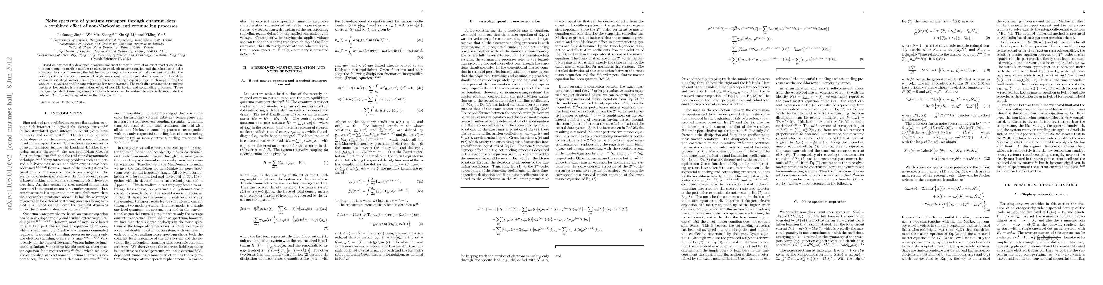 This paper develops a quantum transport theory to analyze noise spectra in quantum dots, revealing characteristic steps and peak-dips in transport current noise due to non-Markovian and cotunneling processes. The study shows that these features can be tuned via bias and gate voltages, potentially enabling modulation of internal Rabi resonance signatures.