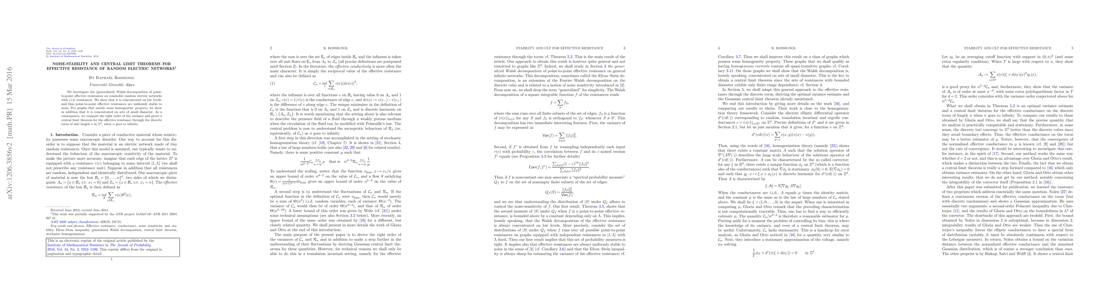 We investigate the (generalized) Walsh decomposition of point-to-point effective resistances on countable random electric networks with i.i.d. resistances. We show that it is concentrated on low levels, and thus point-to-point effective resistances are uniformly stable to noise. For graphs that satisfy some homogeneity property, we show in addition that it is concentrated on sets of small diameter. As a consequence, we compute the right order of the variance and prove a central limit theorem for the effective resistance through the discrete torus of side length $n$ in $\mathbb {Z}^d$, when $n$ goes to infinity.