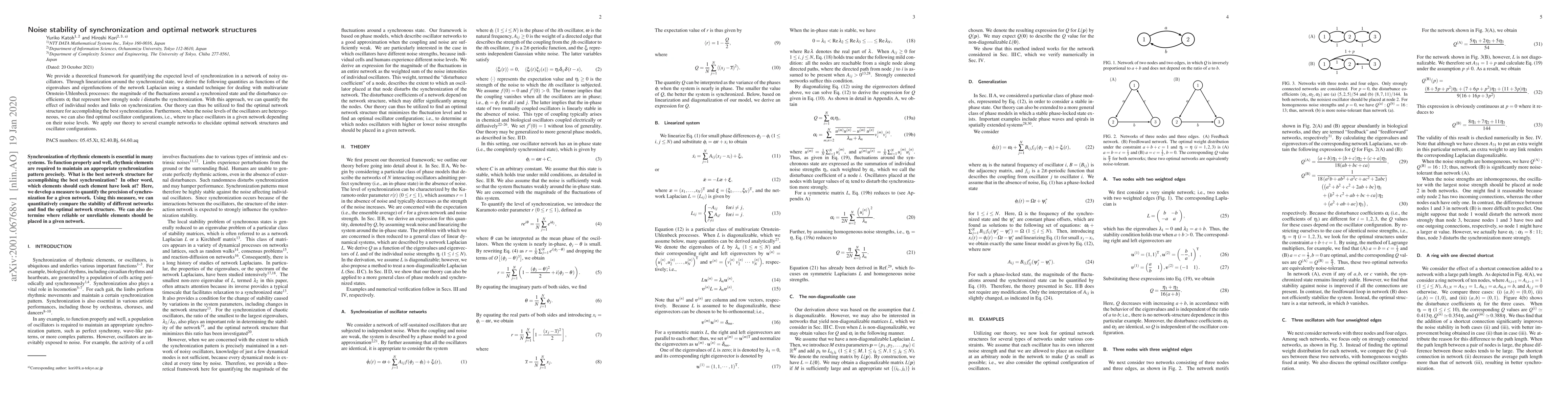 We provide a theoretical framework for quantifying the expected level of synchronization in a network of noisy oscillators. Through linearization around the synchronized state, we derive the following quantities as functions of the eigenvalues and eigenfunctions of the network Laplacian using a standard technique for dealing with multivariate Ornstein-Uhlenbeck processes: the magnitude of the fluctuations around a synchronized state and the disturbance coefficients $\alpha_i$ that represent how strongly node $i$ disturbs the synchronization. With this approach, we can quantify the effect of individual nodes and links on synchronization. Our theory can thus be utilized to find the optimal network structure for accomplishing the best synchronization. Furthermore, when the noise levels of the oscillators are heterogeneous, we can also find optimal oscillator configurations, i.e., where to place oscillators in a given network depending on their noise levels. We apply our theory to several example networks to elucidate optimal network structures and oscillator configurations.