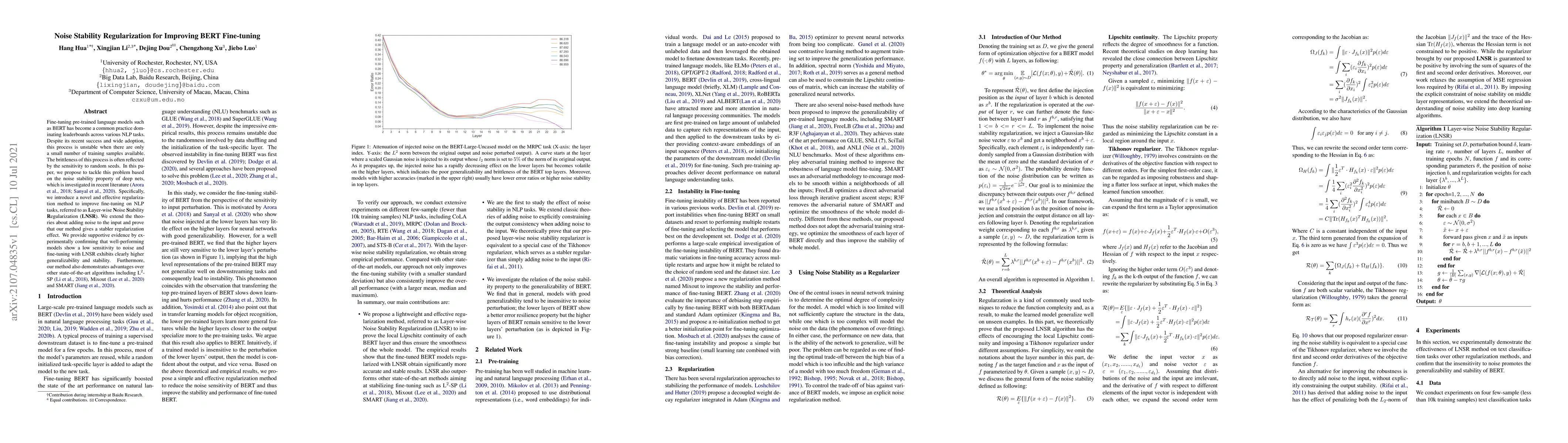 This paper proposes Layer-wise Noise Stability Regularization (LNSR) to enhance the fine-tuning stability of BERT models, especially with limited training samples. The method demonstrates higher generalizability and stability compared to other regularization techniques.
