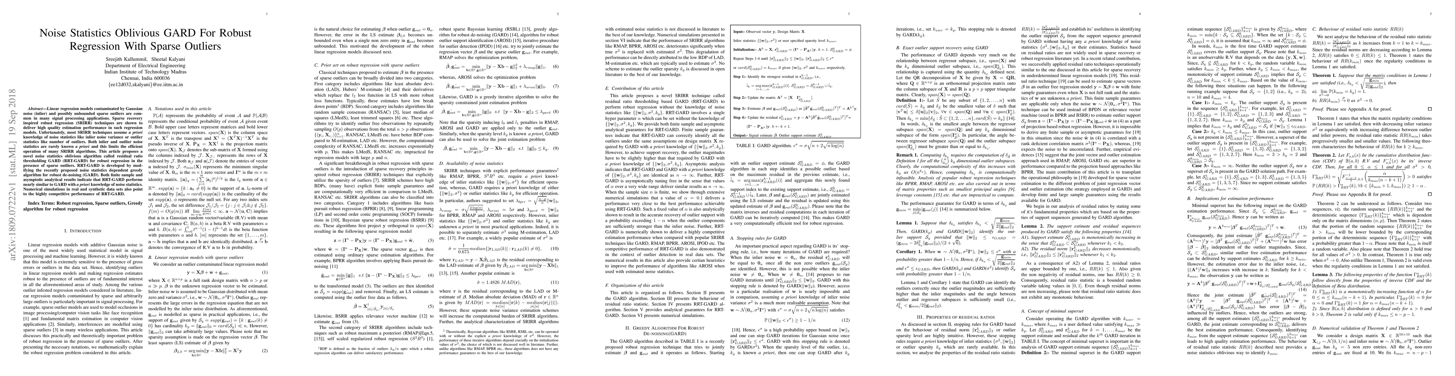 This paper proposes RRT-GARD, a noise statistics oblivious algorithm for robust regression in the presence of sparse outliers, developed from the GARD method. Unlike previous techniques, RRT-GARD does not require prior knowledge of noise statistics, demonstrating competitive performance in both analytical and numerical simulations.