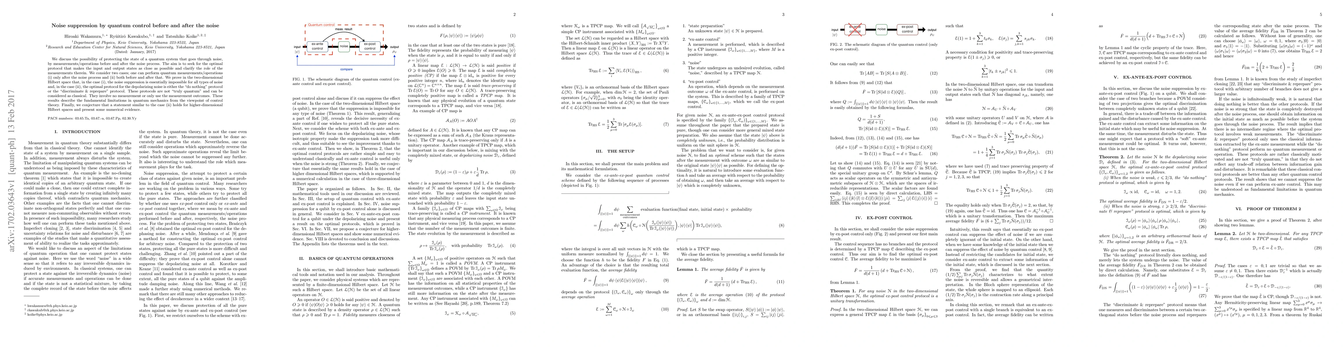 This paper explores quantum control strategies to suppress noise in quantum systems, comparing protocols before and after noise exposure. It finds that noise suppression is impossible post-noise, while pre-and-post-noise protocols for depolarizing noise are classical, not "truly quantum." The study conjectures similar results for higher-dimensional spaces with supporting numerical evidence.