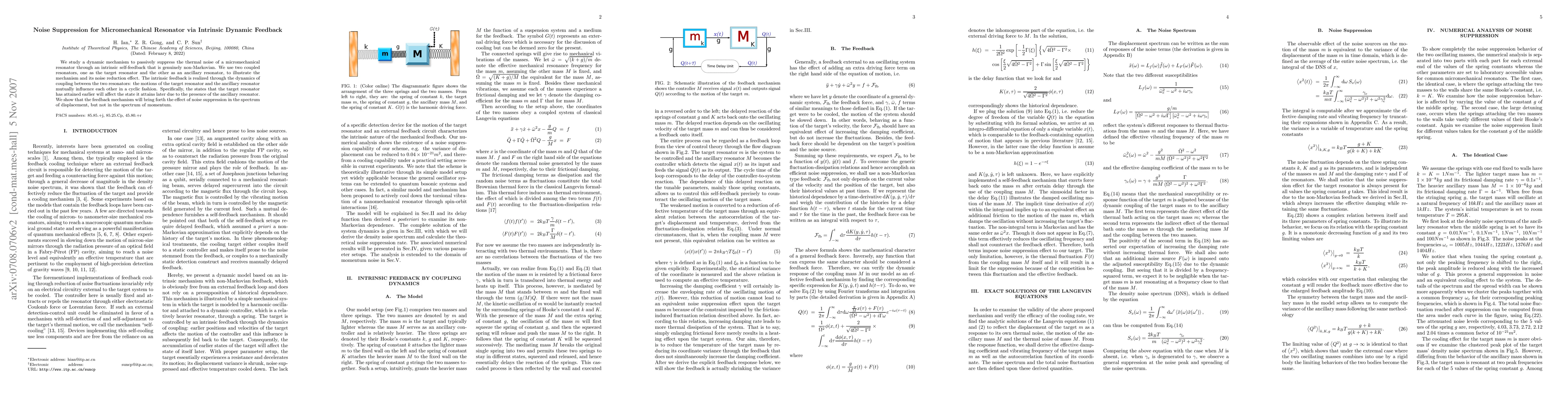 This paper explores a dynamic mechanism using intrinsic self-feedback to passively suppress thermal noise in a micromechanical resonator by coupling it with an ancillary resonator. The feedback mechanism, which is non-Markovian, results in noise reduction in the displacement spectrum but not in the momentum spectrum.