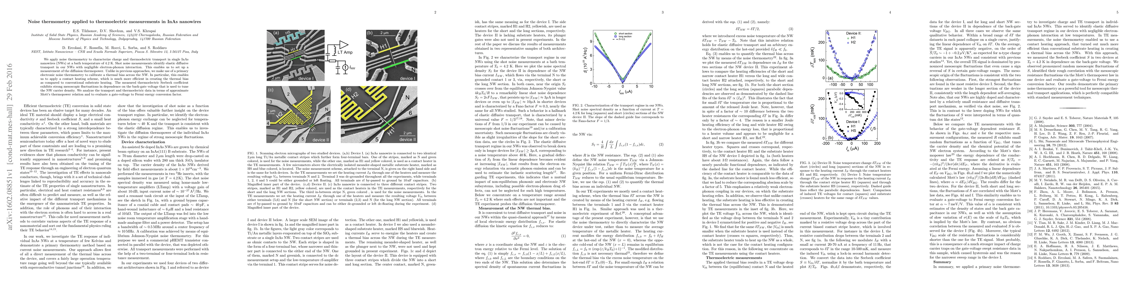 We apply noise thermometry to characterize charge and thermoelectric transport in single InAs nanowires (NWs) at a bath temperature of 4.2 K. Shot noise measurements identify elastic diffusive transport in our NWs with negligible electron-phonon interaction. This enables us to set up a measurement of the diffusion thermopower. Unlike in previous approaches, we make use of a primary electronic noise thermometry to calibrate a thermal bias across the NW. In particular, this enables us to apply a contact heating scheme, which is much more efficient in creating the thermal bias as compared to conventional substrate heating. The measured thermoelectric Seebeck coefficient exhibits strong mesoscopic fluctuations in dependence on the back-gate voltage that is used to tune the NW carrier density. We analyze the transport and thermoelectric data in terms of approximate Mott's thermopower relation and to evaluate a gate-voltage to Fermi energy conversion factor.