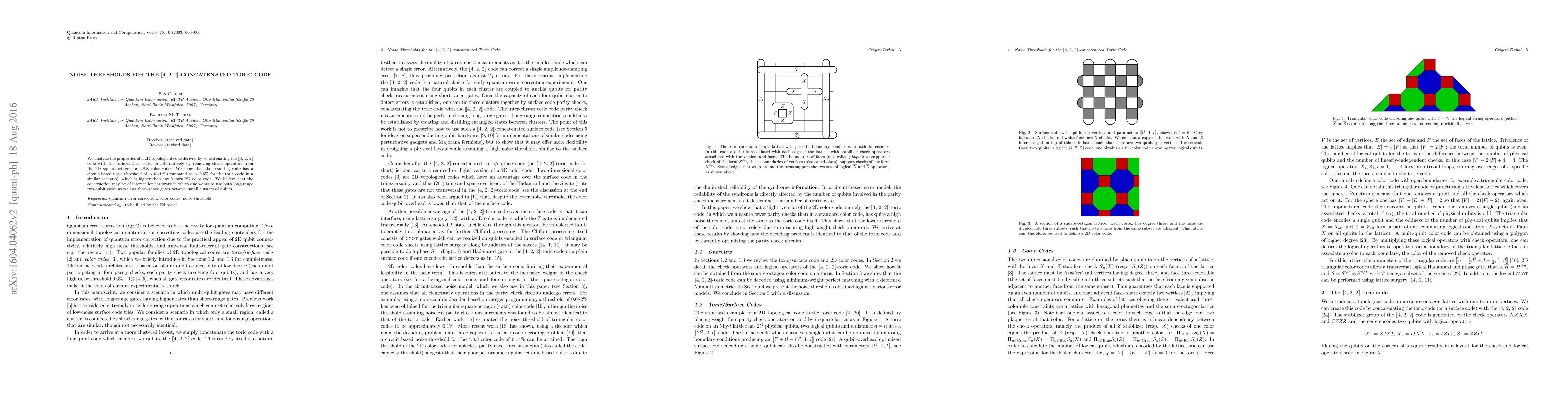 This paper investigates a 2D topological code formed by concatenating the [[4, 2, 2]] code with the toric code, achieving a circuit-based noise threshold of approximately 0.41%, significantly higher than the toric code's 0.6%. This enhanced threshold makes it a promising candidate for hardware requiring both long-range and short-range qubit interactions.