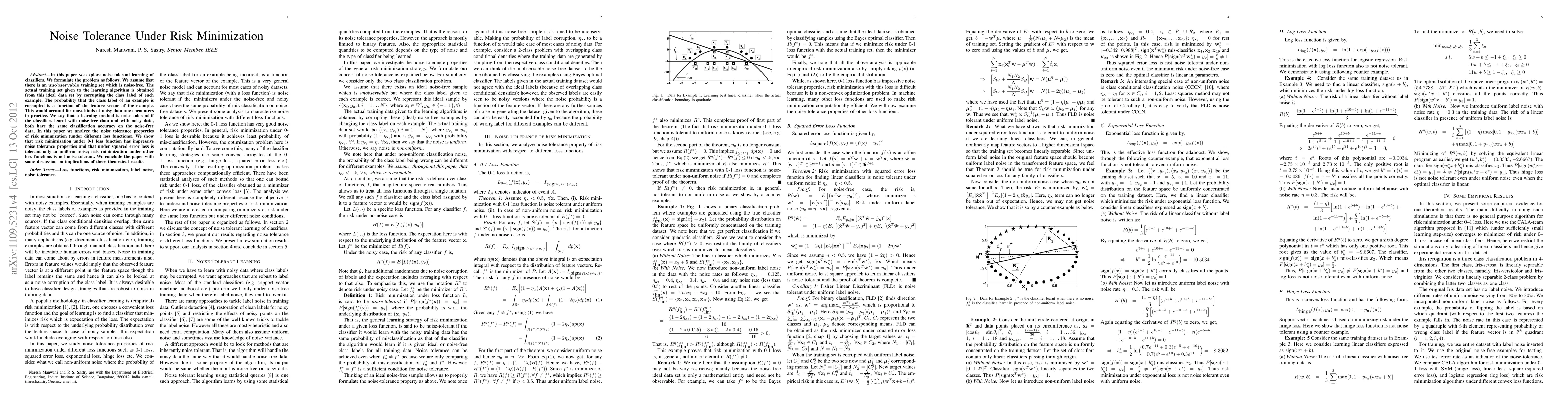 This paper investigates noise-tolerant learning of classifiers, focusing on risk minimization under various loss functions. It finds that risk minimization with the 0-1 loss function exhibits strong noise tolerance, while squared error loss is only tolerant to uniform noise, and other loss functions do not show noise tolerance.