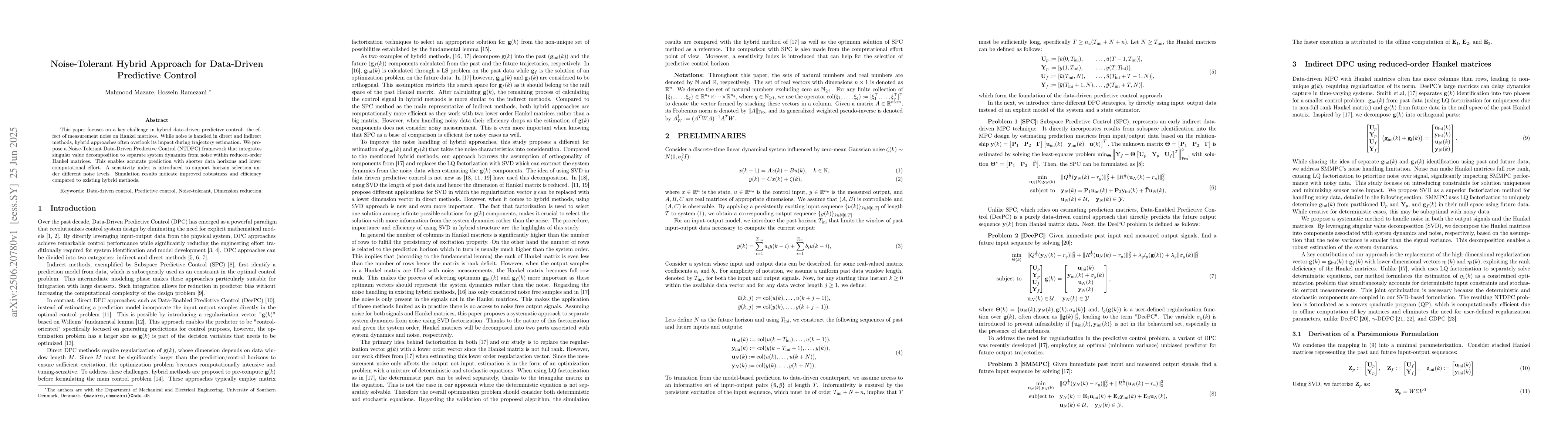 This paper focuses on a key challenge in hybrid data-driven predictive control: the effect of measurement noise on Hankel matrices. While noise is handled in direct and indirect methods, hybrid approaches often overlook its impact during trajectory estimation. We propose a Noise-Tolerant Data-Driven Predictive Control (NTDPC) framework that integrates singular value decomposition to separate system dynamics from noise within reduced-order Hankel matrices. This enables accurate prediction with shorter data horizons and lower computational effort. A sensitivity index is introduced to support horizon selection under different noise levels. Simulation results indicate improved robustness and efficiency compared to existing hybrid methods.