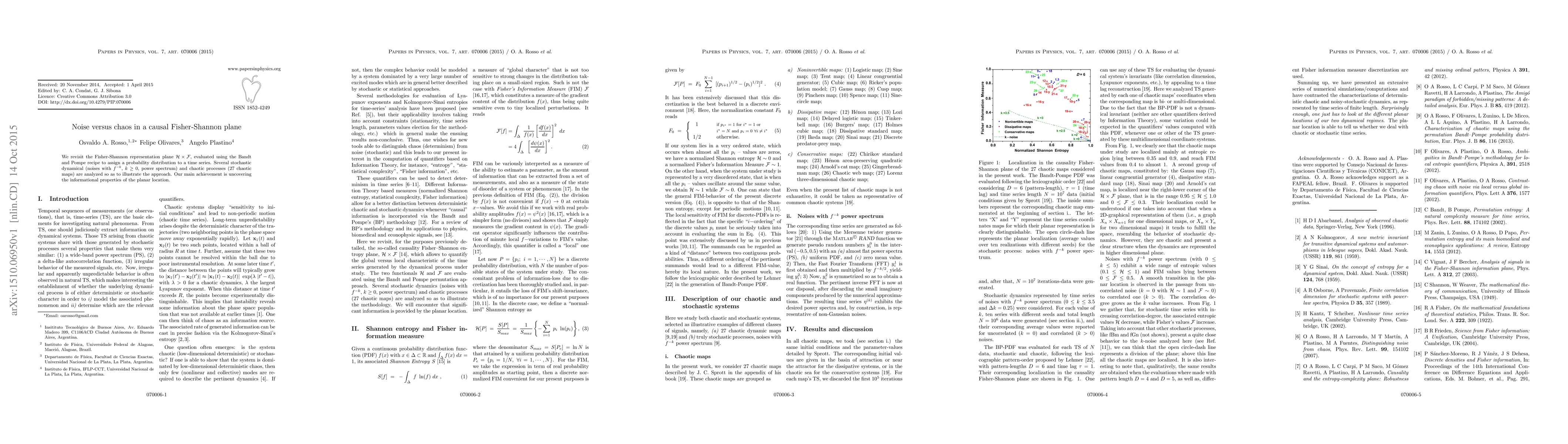 This paper explores the Fisher-Shannon plane ${\mathcal H} \times {\mathcal F}$ to distinguish between noise and chaos in time series, using Bandt and Pompe's method. It analyzes various stochastic and chaotic processes to reveal the informational properties of their locations on the plane.