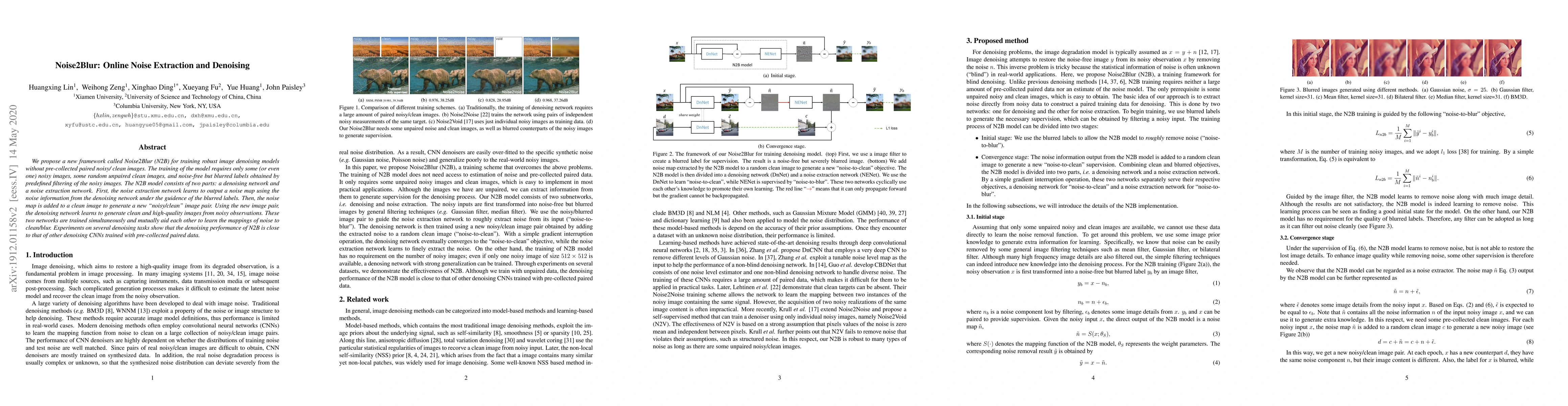 The Noise2Blur (N2B) framework trains robust image denoising models using only noisy images, unpaired clean images, and blurred labels, without requiring paired noisy/clean image datasets. It employs two networks: a denoising network and a noise extraction network, which are trained simultaneously to extract noise and denoise images, achieving performance comparable to CNNs trained with paired data.
