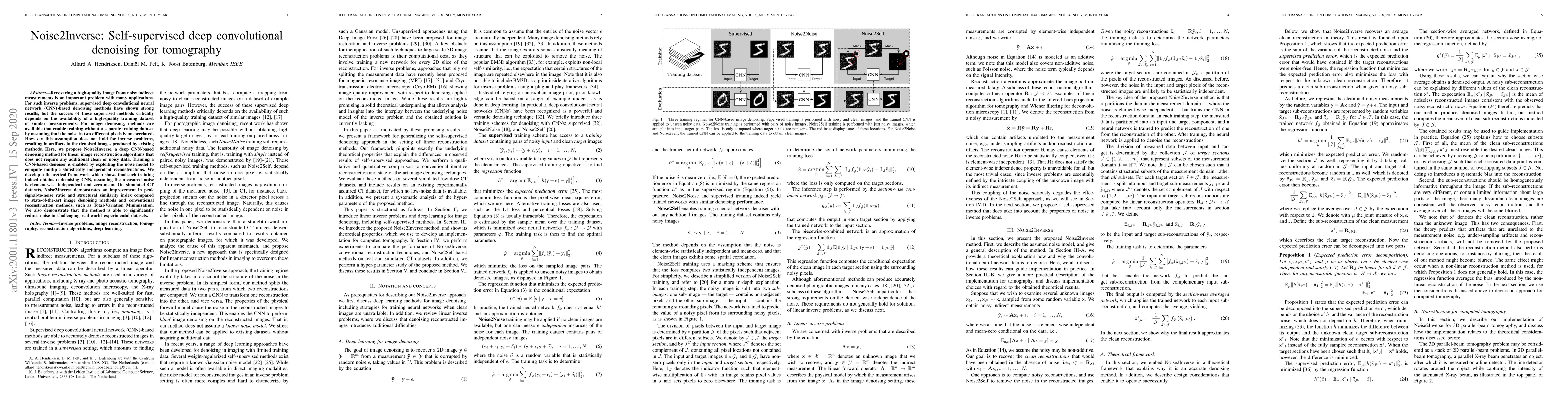 Recovering a high-quality image from noisy indirect measurements is an important problem with many applications. For such inverse problems, supervised deep convolutional neural network (CNN)-based denoising methods have shown strong results, but the success of these supervised methods critically depends on the availability of a high-quality training dataset of similar measurements. For image denoising, methods are available that enable training without a separate training dataset by assuming that the noise in two different pixels is uncorrelated. However, this assumption does not hold for inverse problems, resulting in artifacts in the denoised images produced by existing methods. Here, we propose Noise2Inverse, a deep CNN-based denoising method for linear image reconstruction algorithms that does not require any additional clean or noisy data. Training a CNN-based denoiser is enabled by exploiting the noise model to compute multiple statistically independent reconstructions. We develop a theoretical framework which shows that such training indeed obtains a denoising CNN, assuming the measured noise is element-wise independent and zero-mean. On simulated CT datasets, Noise2Inverse demonstrates an improvement in peak signal-to-noise ratio and structural similarity index compared to state-of-the-art image denoising methods and conventional reconstruction methods, such as Total-Variation Minimization. We also demonstrate that the method is able to significantly reduce noise in challenging real-world experimental datasets.