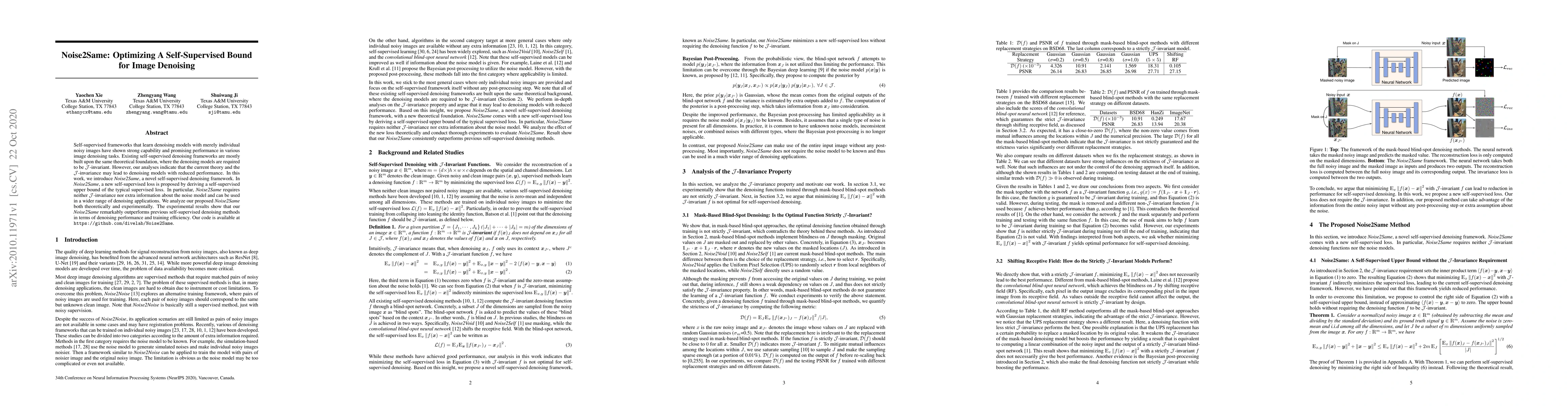 Noise2Same is a novel self-supervised framework for image denoising that proposes a new self-supervised loss derived from a self-supervised upper bound of the supervised loss, achieving superior performance without requiring J-invariance or knowledge of the noise model. Experimental results show significant improvements over previous methods.