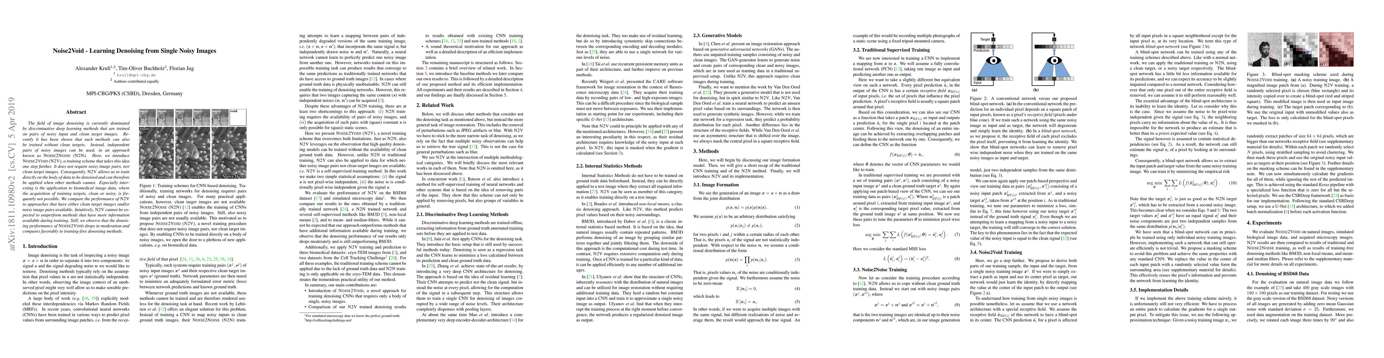 Researchers introduce Noise2Void, a training scheme for image denoising that can train directly on noisy data without clean targets or pairs, allowing it to be applied in challenging biomedical imaging scenarios.